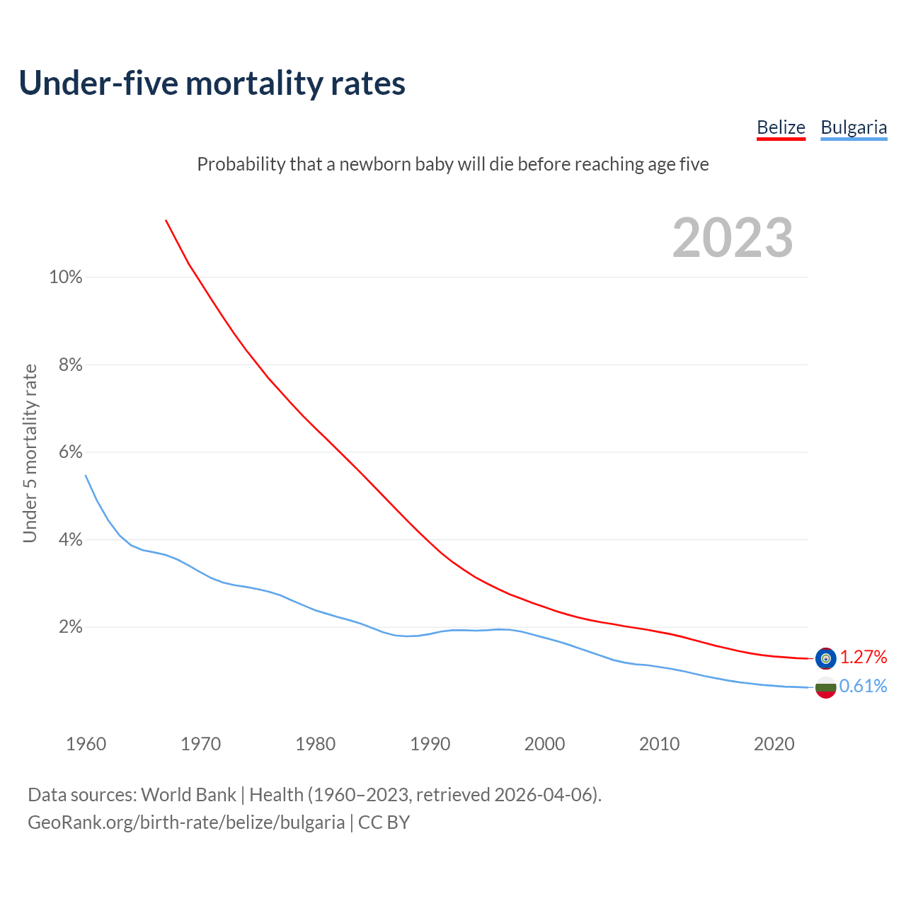 The chance that a newborn baby will die before reaching age five is 1.27% in Belize and 0.61% in Bulgaria. Above is a chart with historical data on under-five mortality rates.