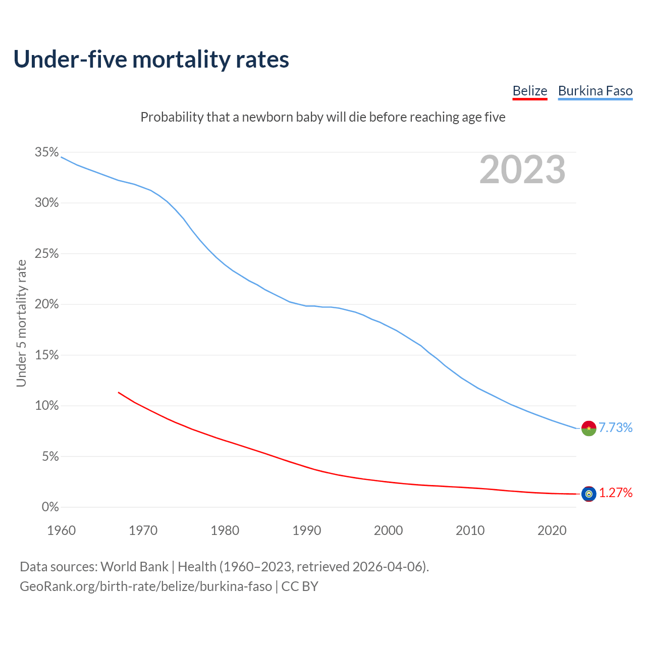The chance that a newborn baby will die before reaching age five is 1.27% in Belize and 7.73% in Burkina Faso. Above is a chart with historical data on under-five mortality rates.