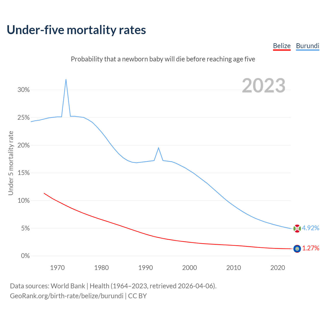 The chance that a newborn baby will die before reaching age five is 1.27% in Belize and 4.92% in Burundi. Above is a chart with historical data on under-five mortality rates.
