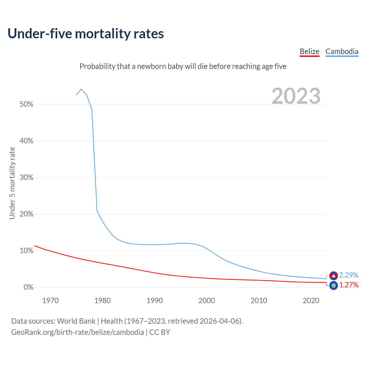The chance that a newborn baby will die before reaching age five is 1.27% in Belize and 2.29% in Cambodia. Above is a chart with historical data on under-five mortality rates.