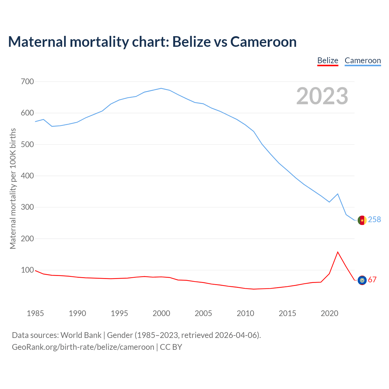 The maternal mortality rate, which is the probability of dying during childbirth or within 42 days of pregnancy termination, is 67 deaths per 100,000 live births in Belize, compared to 258 deaths in Cameroon.