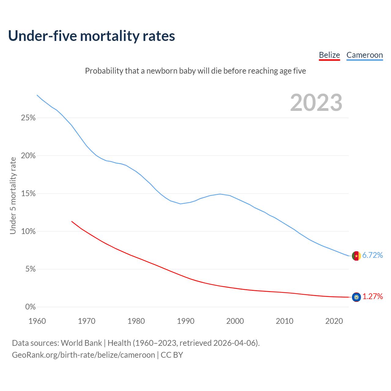 The chance that a newborn baby will die before reaching age five is 1.27% in Belize and 6.72% in Cameroon. Above is a chart with historical data on under-five mortality rates.