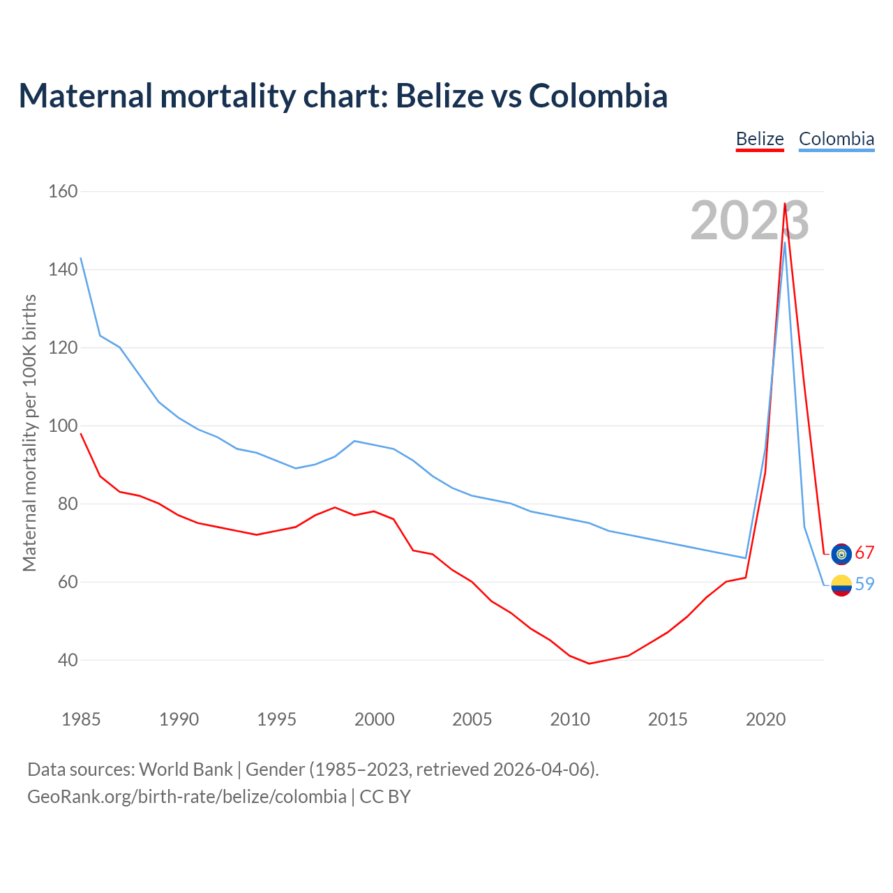 The maternal mortality rate, which is the probability of dying during childbirth or within 42 days of pregnancy termination, is 67 deaths per 100,000 live births in Belize, compared to 59 deaths in Colombia.