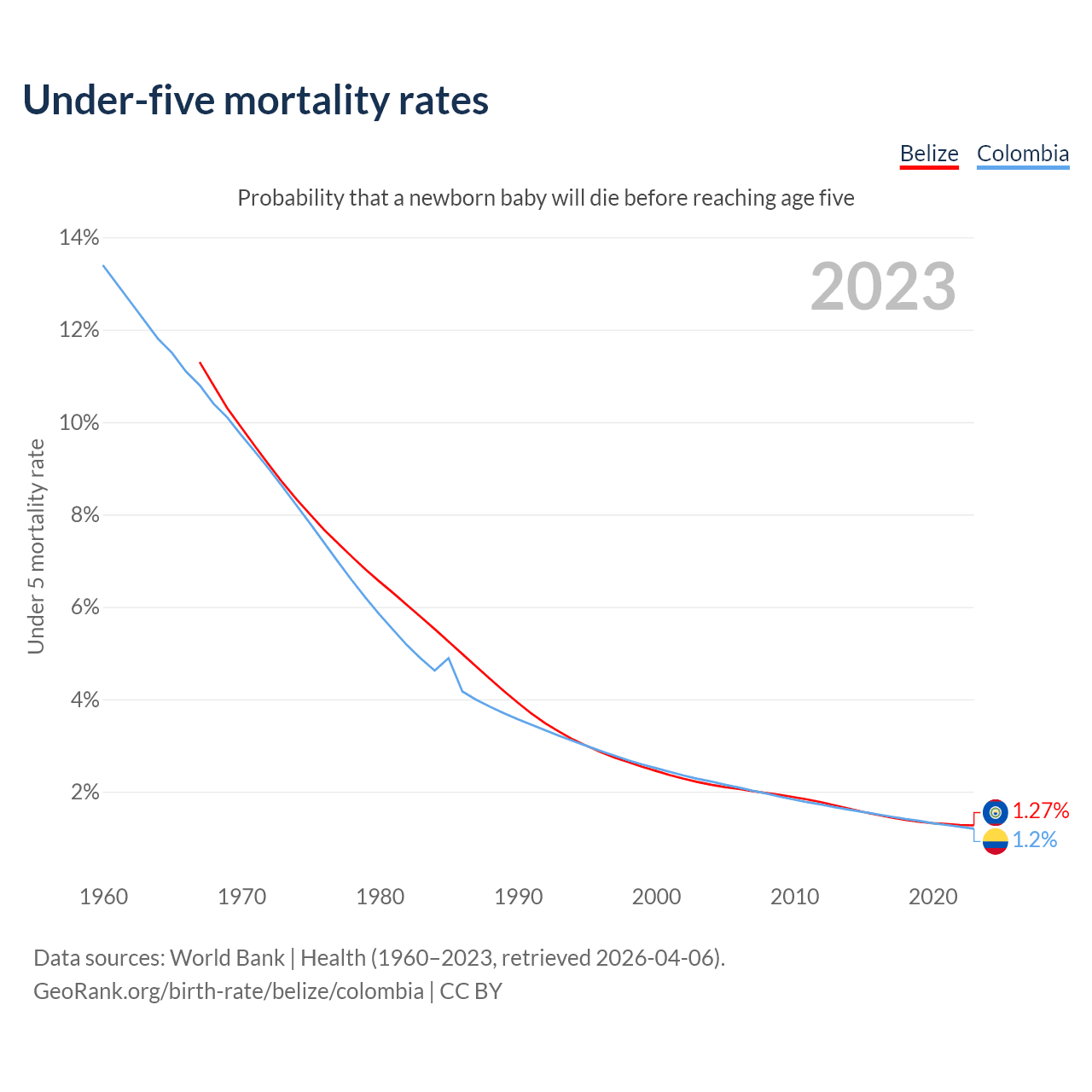 The chance that a newborn baby will die before reaching age five is 1.27% in Belize and 1.2% in Colombia. Above is a chart with historical data on under-five mortality rates.