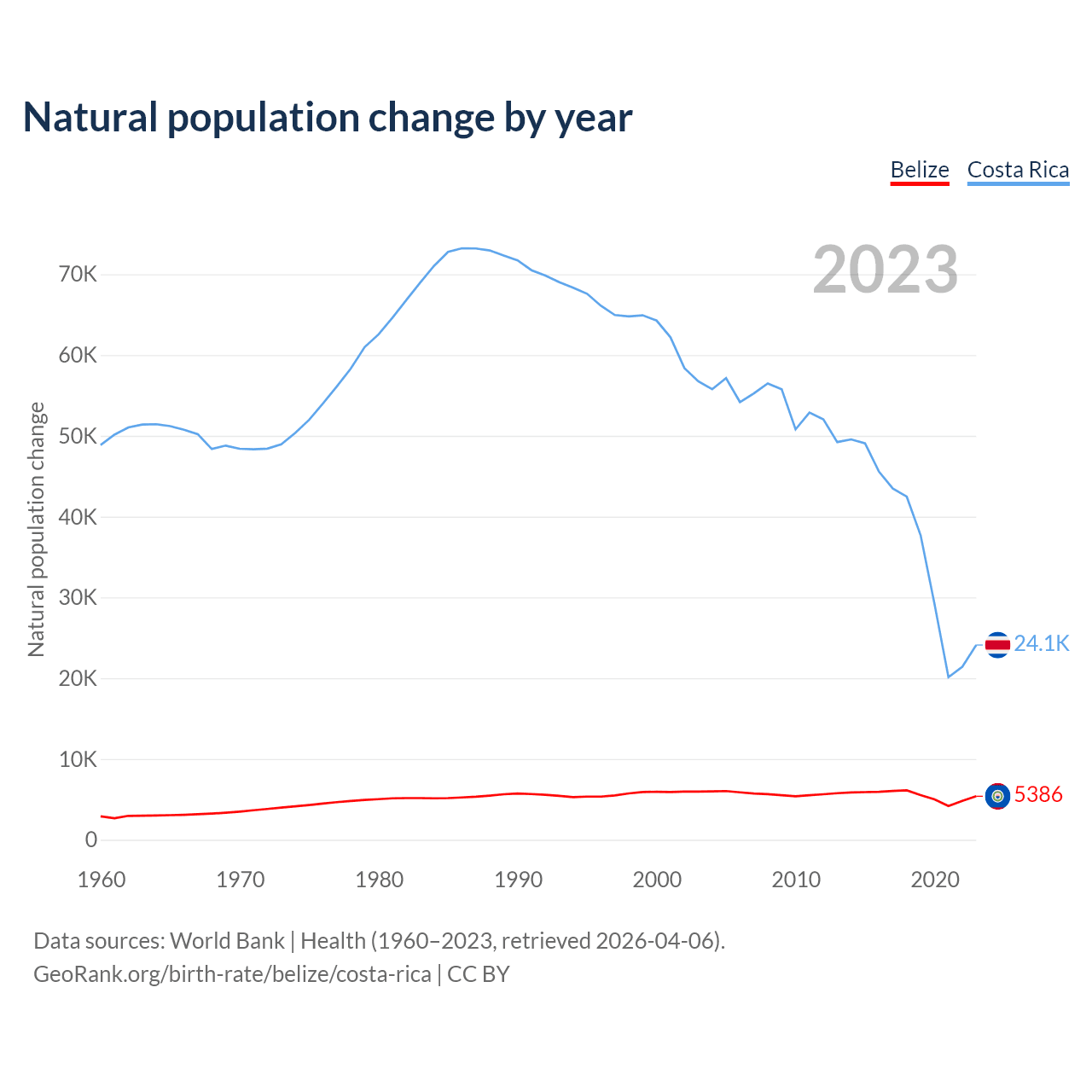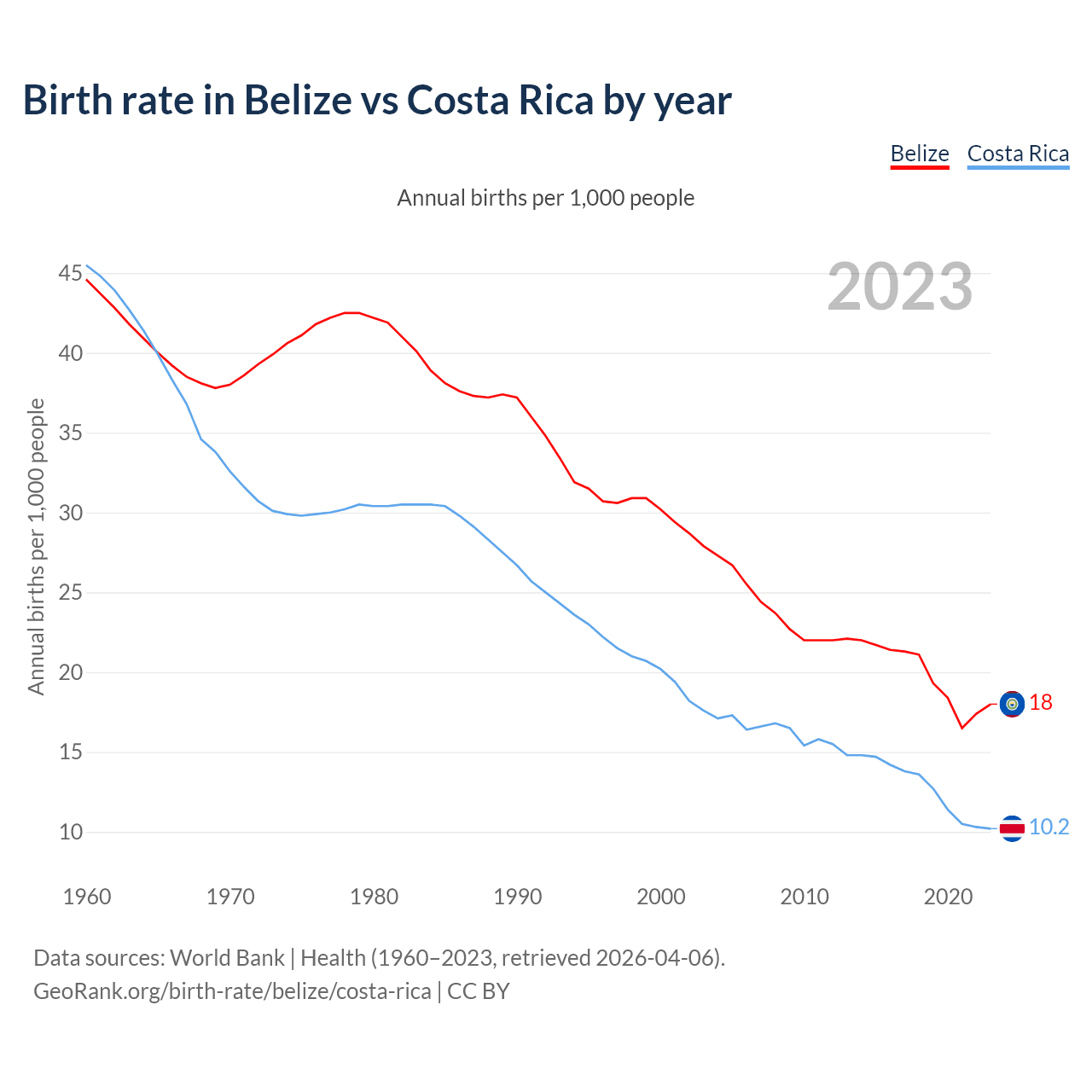 According to the latest available data on birth rates, the fertility rate in Belize was 2.01 children per woman in 2023, compared to 1.33 in Costa Rica in 2023. The replacement level is considered to be 2.1 children per woman.