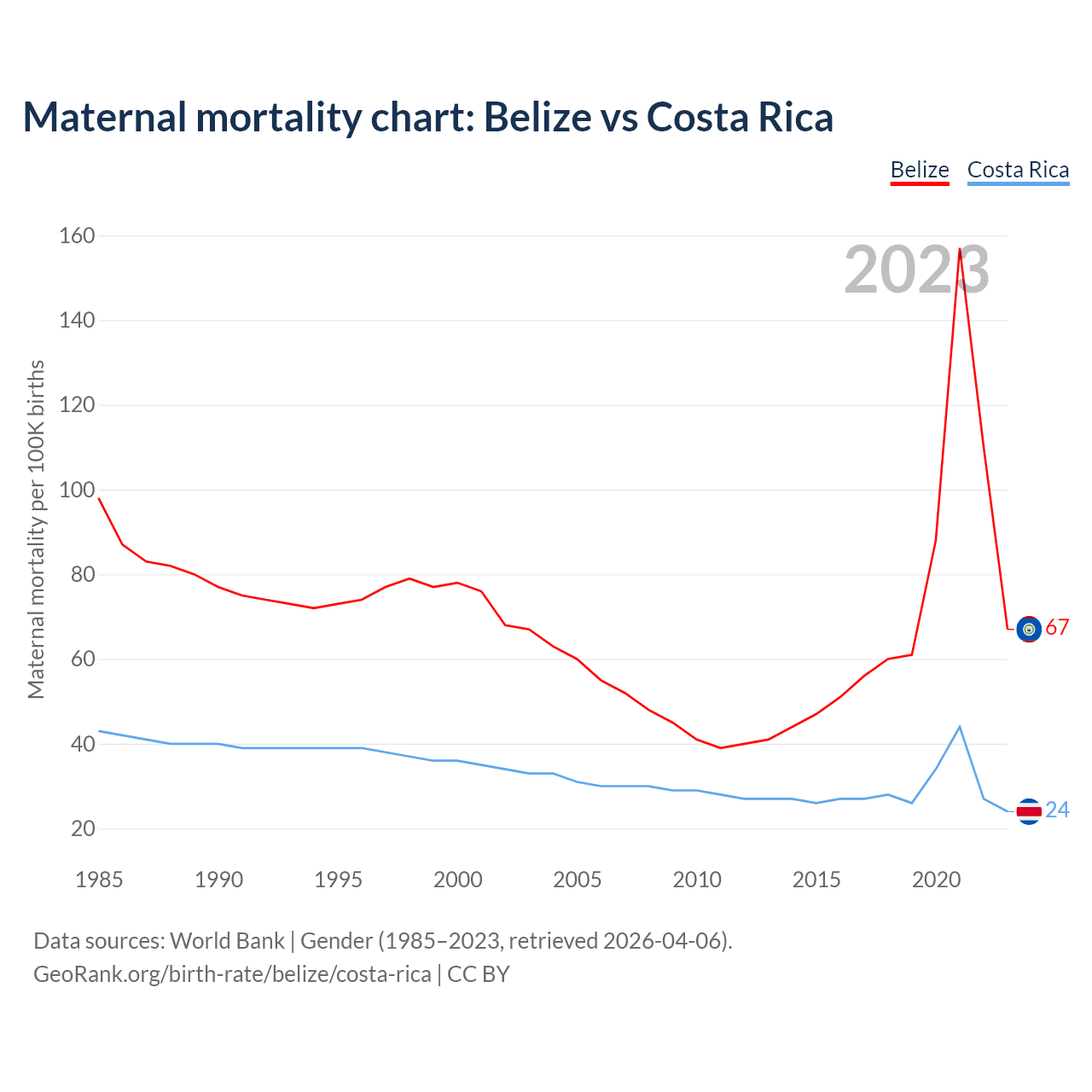The maternal mortality rate, which is the probability of dying during childbirth or within 42 days of pregnancy termination, is 67 deaths per 100,000 live births in Belize, compared to 24 deaths in Costa Rica.
