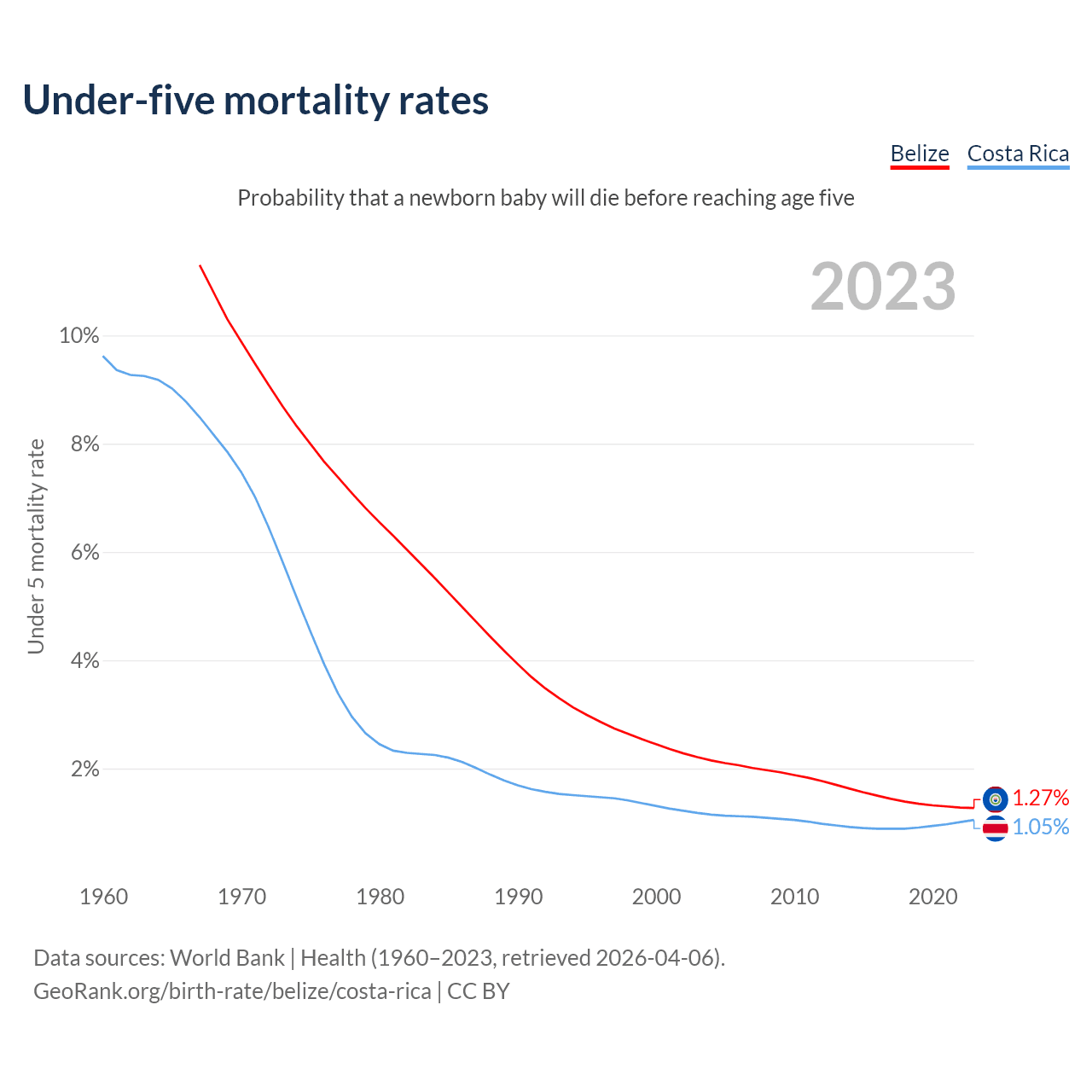 The chance that a newborn baby will die before reaching age five is 1.27% in Belize and 1.05% in Costa Rica. Above is a chart with historical data on under-five mortality rates.