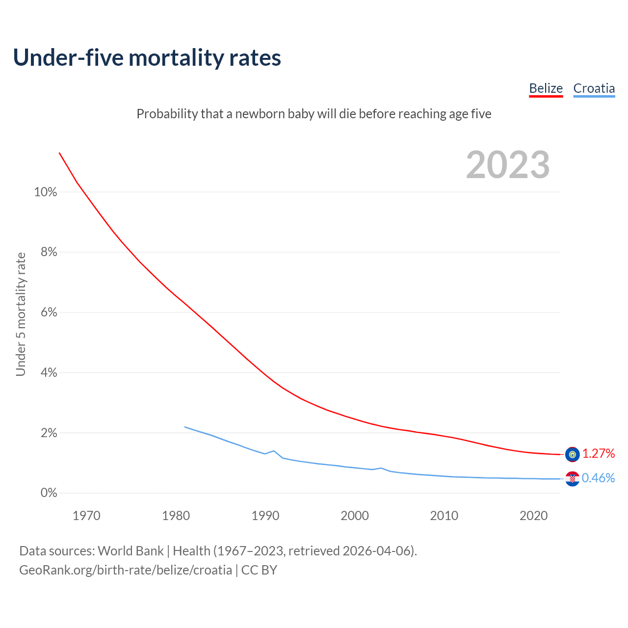 The chance that a newborn baby will die before reaching age five is 1.27% in Belize and 0.46% in Croatia. Above is a chart with historical data on under-five mortality rates.