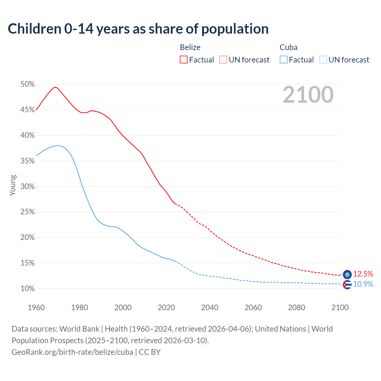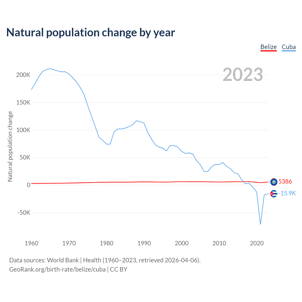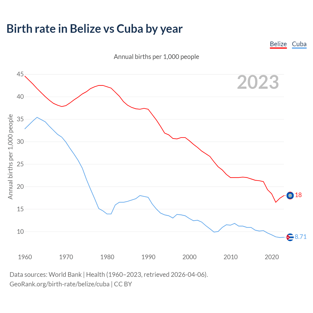 According to the latest available data on birth rates, the fertility rate in Belize was 2.01 children per woman in 2023, compared to 1.44 in Cuba in 2023. The replacement level is considered to be 2.1 children per woman.