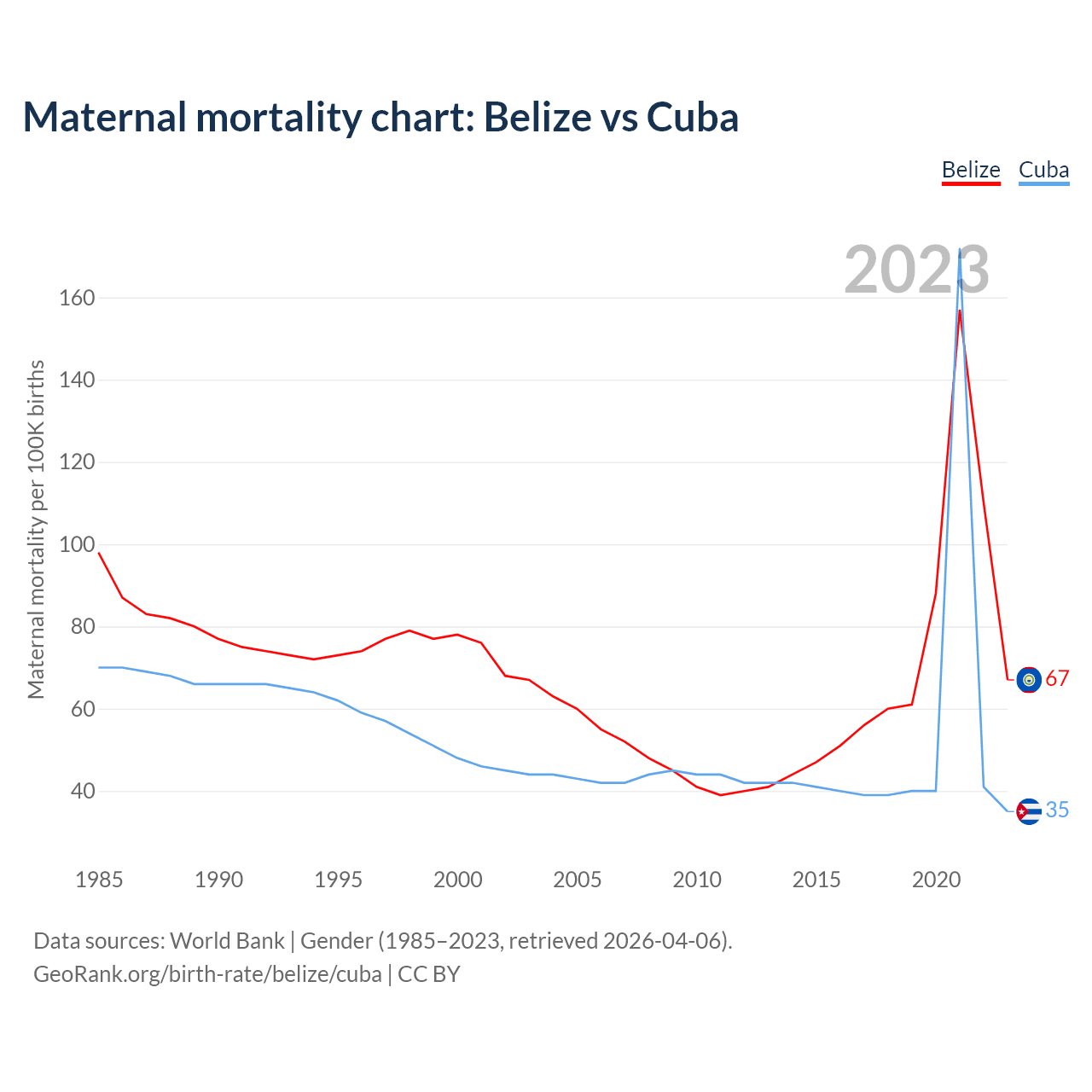 The maternal mortality rate, which is the probability of dying during childbirth or within 42 days of pregnancy termination, is 67 deaths per 100,000 live births in Belize, compared to 35 deaths in Cuba.