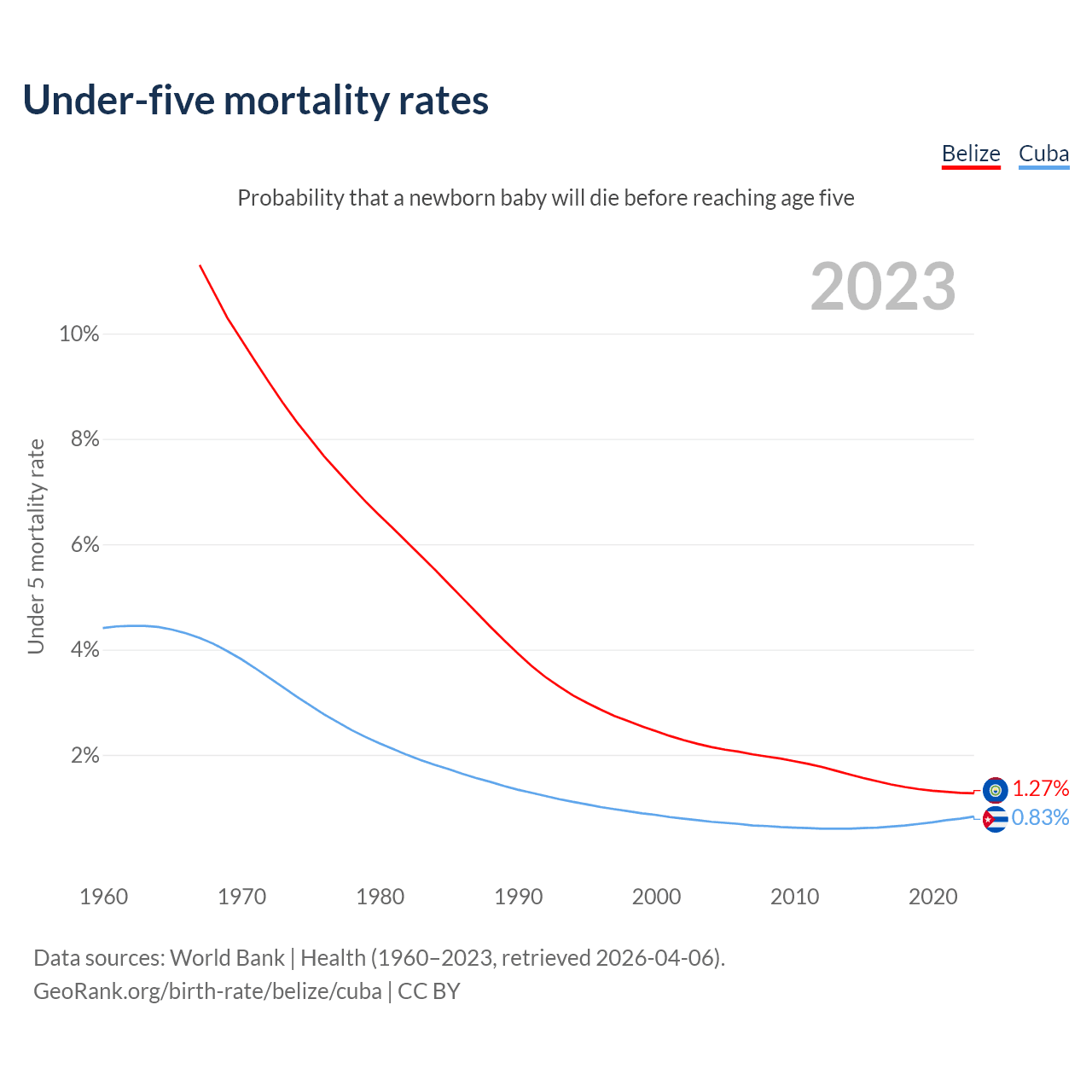The chance that a newborn baby will die before reaching age five is 1.27% in Belize and 0.83% in Cuba. Above is a chart with historical data on under-five mortality rates.