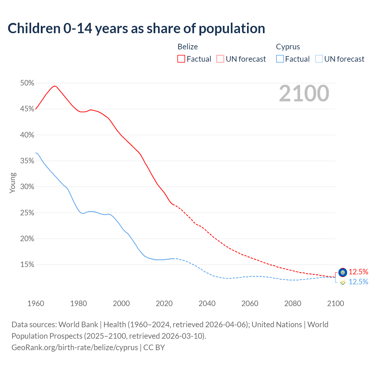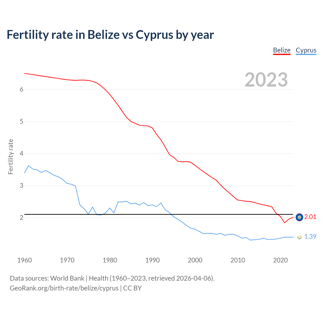 According to the latest available data on birth rates, the fertility rate in Belize was 2.01 children per woman in 2023, compared to 1.39 in Cyprus in 2023. The replacement level is considered to be 2.1 children per woman.
