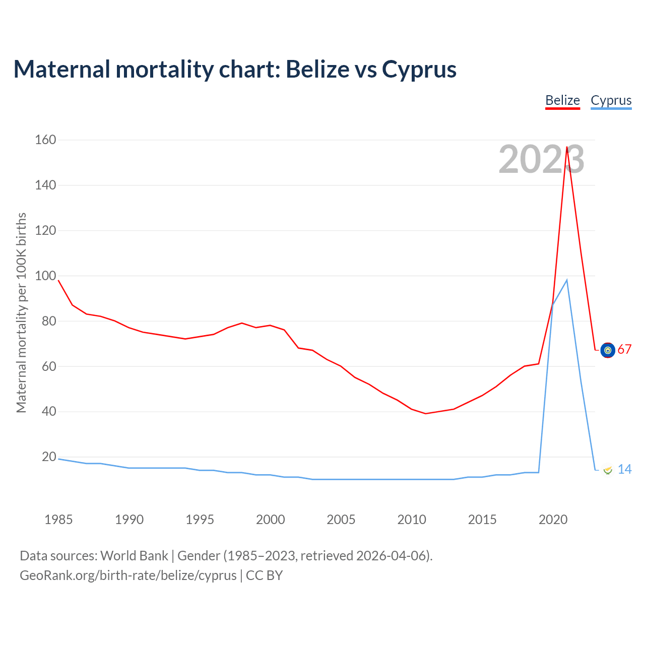 The maternal mortality rate, which is the probability of dying during childbirth or within 42 days of pregnancy termination, is 67 deaths per 100,000 live births in Belize, compared to 14 deaths in Cyprus.