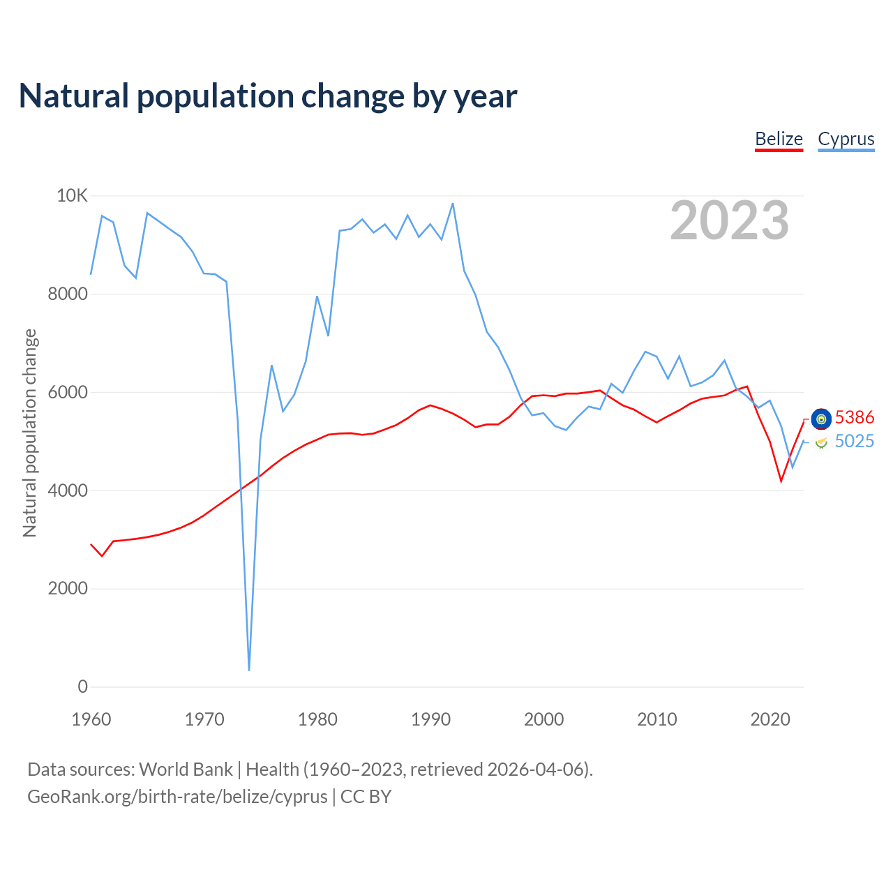 Belize has an annual birth rate of 18 births per 1,000 people, compared to 10.8 for Cyprus. The average number of children a woman is expected to have during her lifetime — the fertility rate, is 2.01 in Belize and 1.39 in Cyprus — 30.8% difference.