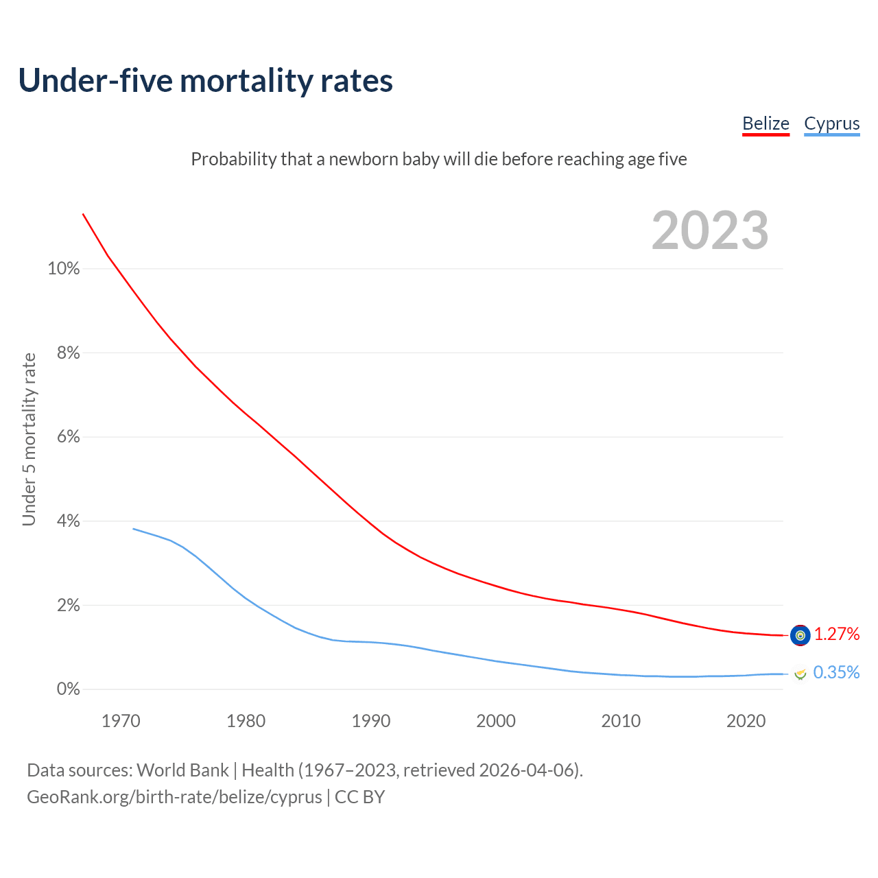 The chance that a newborn baby will die before reaching age five is 1.27% in Belize and 0.35% in Cyprus. Above is a chart with historical data on under-five mortality rates.