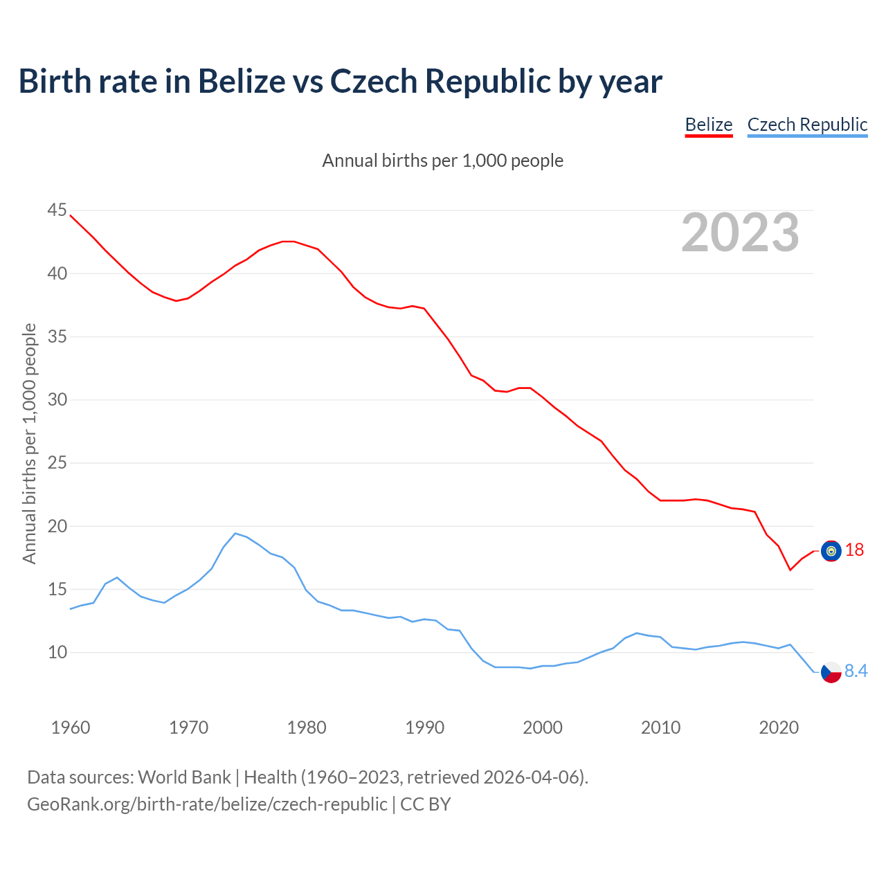 Belize has an annual birth rate of 18 births per 1,000 people, compared to 8.4 for the Czech Republic. The average number of children a woman is expected to have during her lifetime — the fertility rate, is 2.01 in Belize and 1.45 in the Czech Republic — 27.8% difference.
