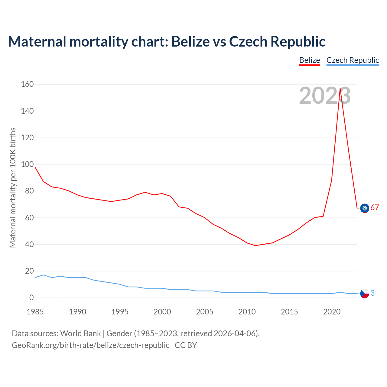 The maternal mortality rate, which is the probability of dying during childbirth or within 42 days of pregnancy termination, is 67 deaths per 100,000 live births in Belize, compared to 3 deaths in the Czech Republic.
