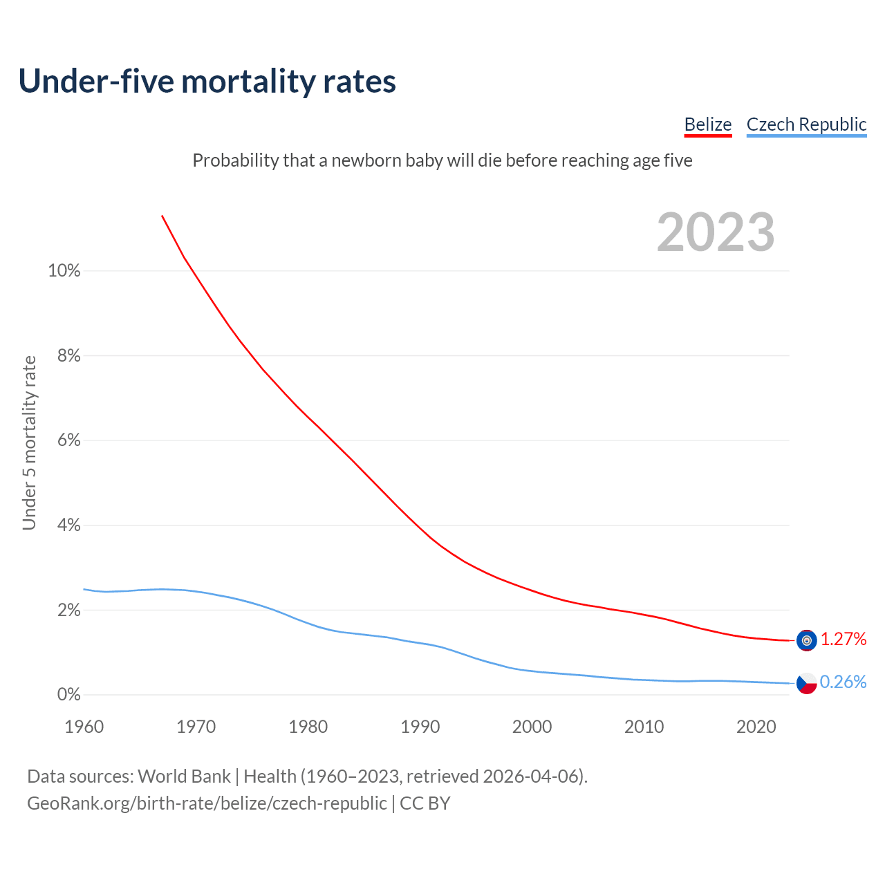 The chance that a newborn baby will die before reaching age five is 1.27% in Belize and 0.26% in the Czech Republic. Above is a chart with historical data on under-five mortality rates.