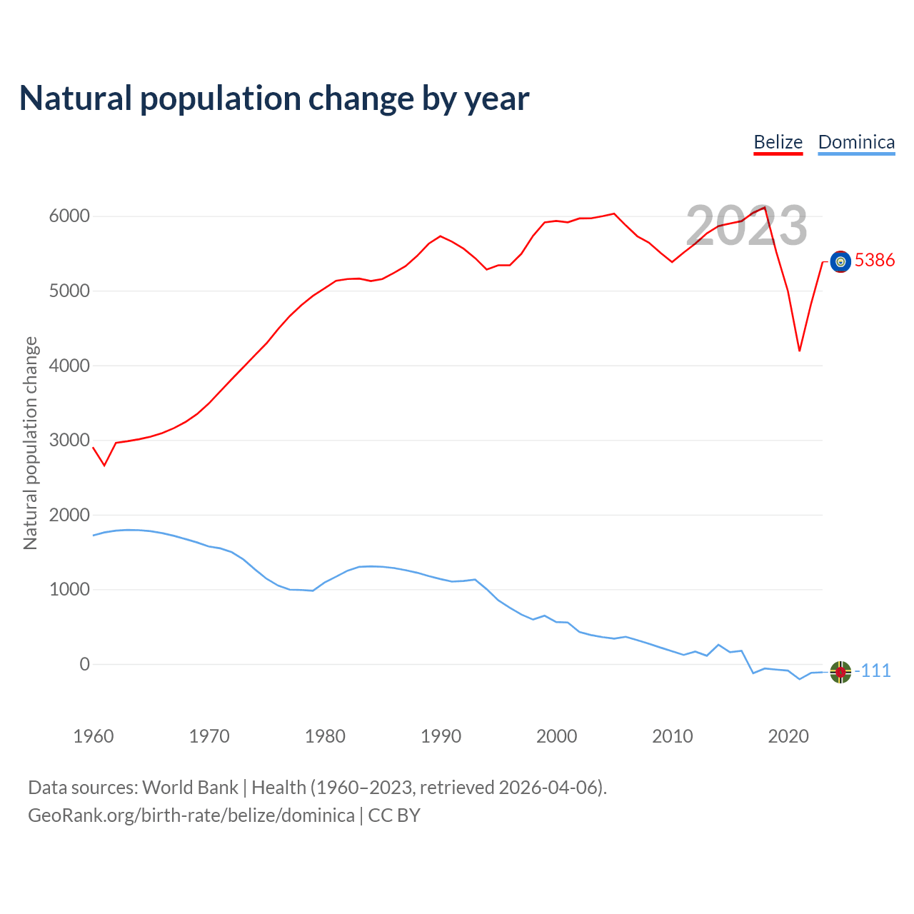 According to the latest available data on birth rates, the fertility rate in Belize was 2.01 children per woman in 2023, compared to 1.48 in Dominica in 2023. The replacement level is considered to be 2.1 children per woman.