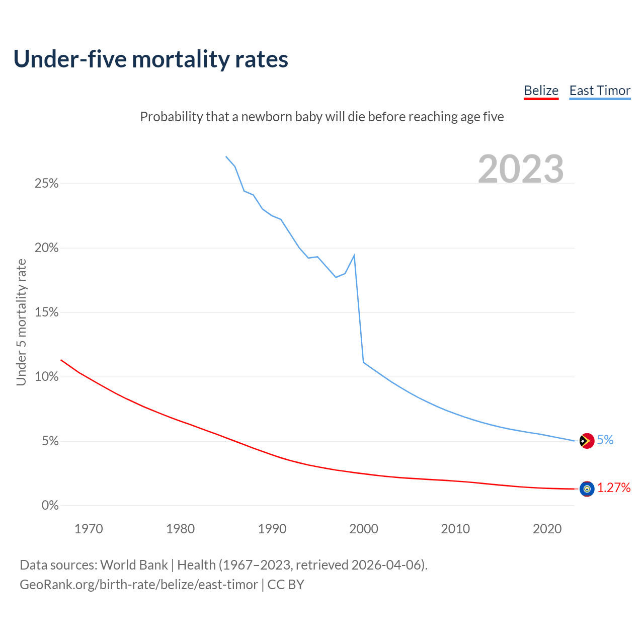 The chance that a newborn baby will die before reaching age five is 1.27% in Belize and 5% in East Timor. Above is a chart with historical data on under-five mortality rates.