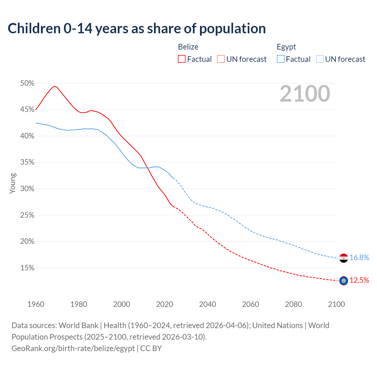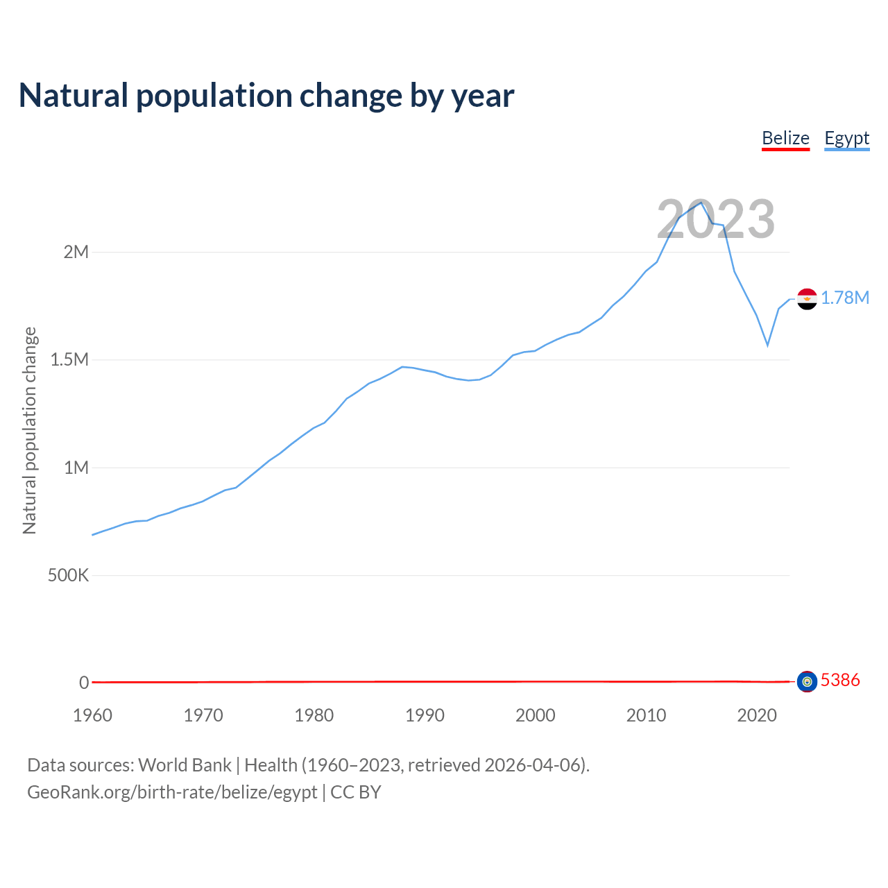 According to the latest available data on birth rates, the fertility rate in Belize was 2.01 children per woman in 2023, compared to 2.75 in Egypt in 2023. The replacement level is considered to be 2.1 children per woman.