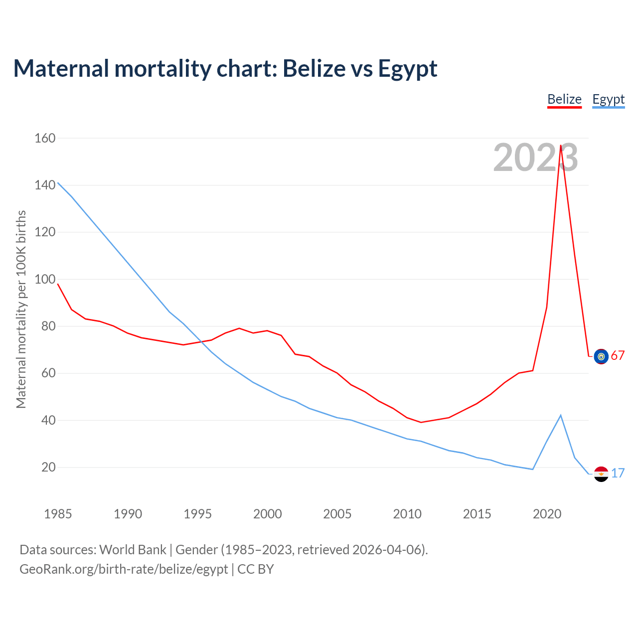 The maternal mortality rate, which is the probability of dying during childbirth or within 42 days of pregnancy termination, is 67 deaths per 100,000 live births in Belize, compared to 17 deaths in Egypt.
