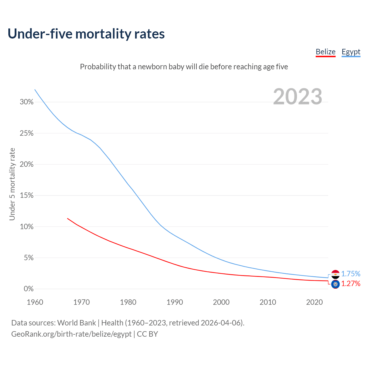 The chance that a newborn baby will die before reaching age five is 1.27% in Belize and 1.75% in Egypt. Above is a chart with historical data on under-five mortality rates.