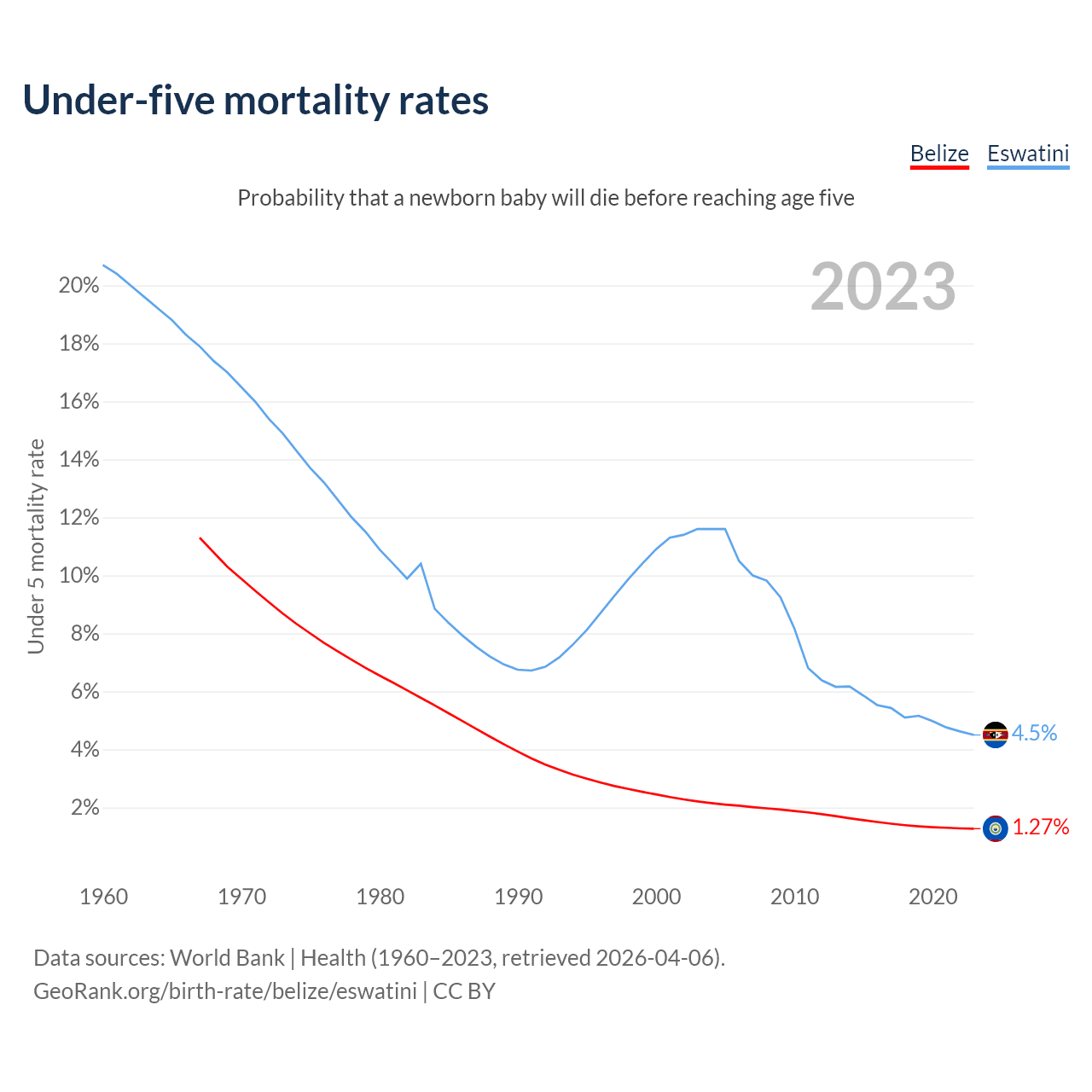 The chance that a newborn baby will die before reaching age five is 1.27% in Belize and 4.5% in Eswatini. Above is a chart with historical data on under-five mortality rates.