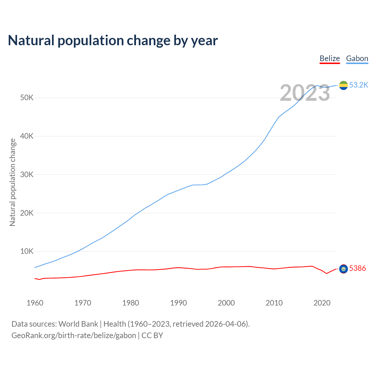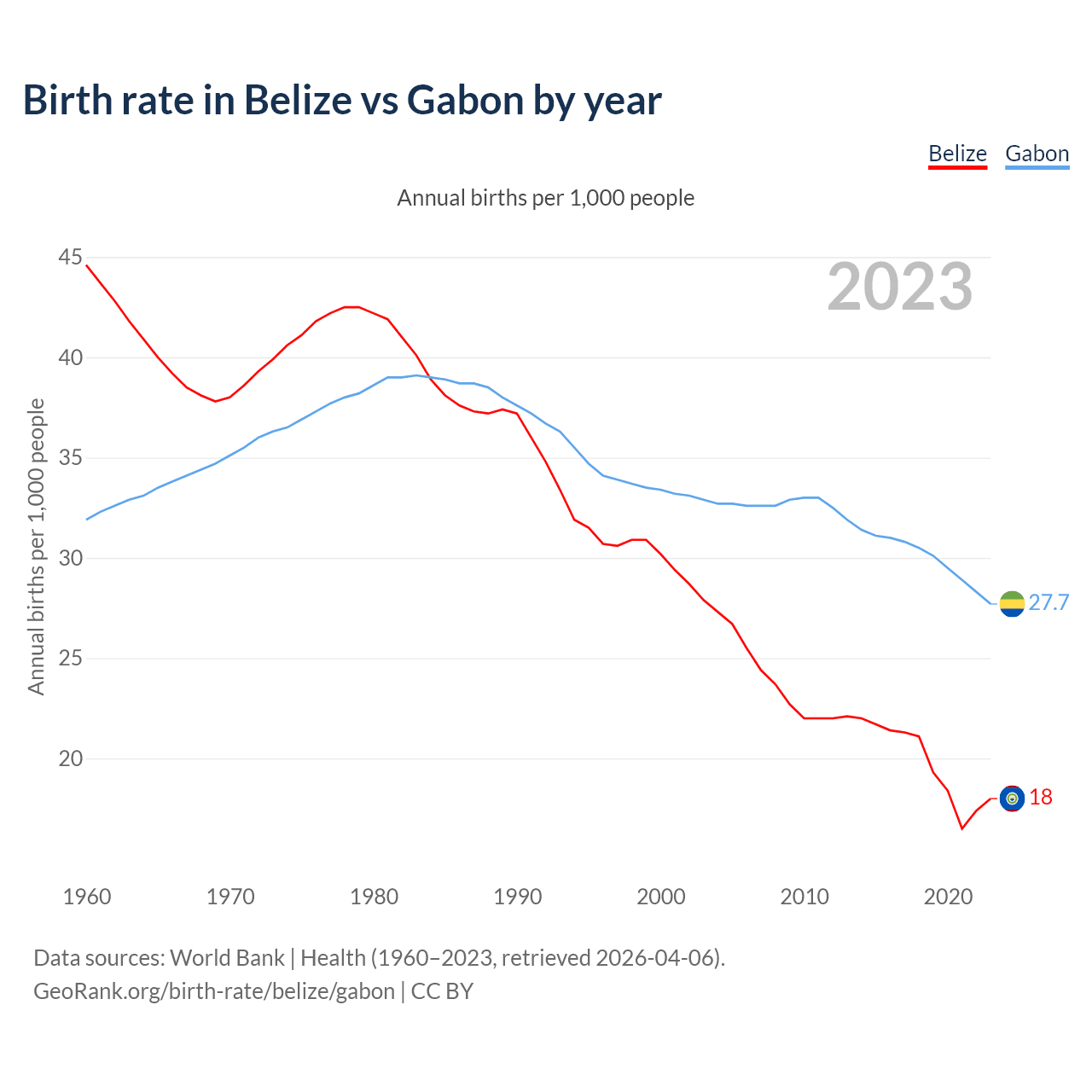Belize has an annual birth rate of 18 births per 1,000 people, compared to 27.7 for Gabon. The average number of children a woman is expected to have during her lifetime — the fertility rate, is 2.01 in Belize and 3.65 in Gabon — 81.7% difference.