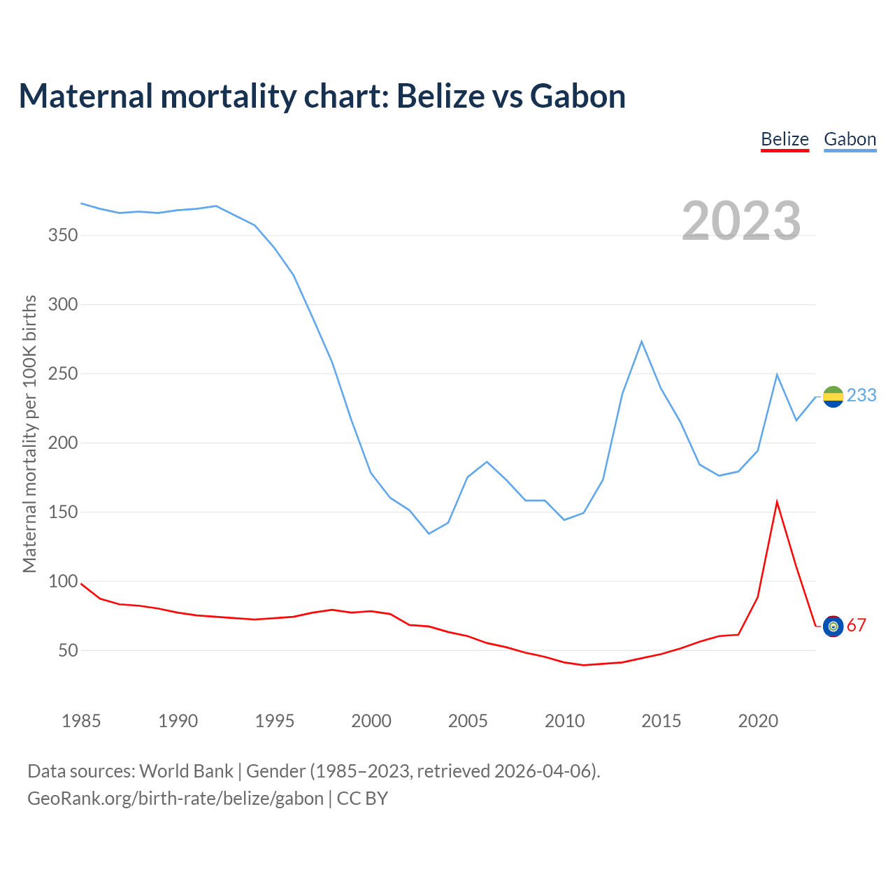 The maternal mortality rate, which is the probability of dying during childbirth or within 42 days of pregnancy termination, is 67 deaths per 100,000 live births in Belize, compared to 233 deaths in Gabon.