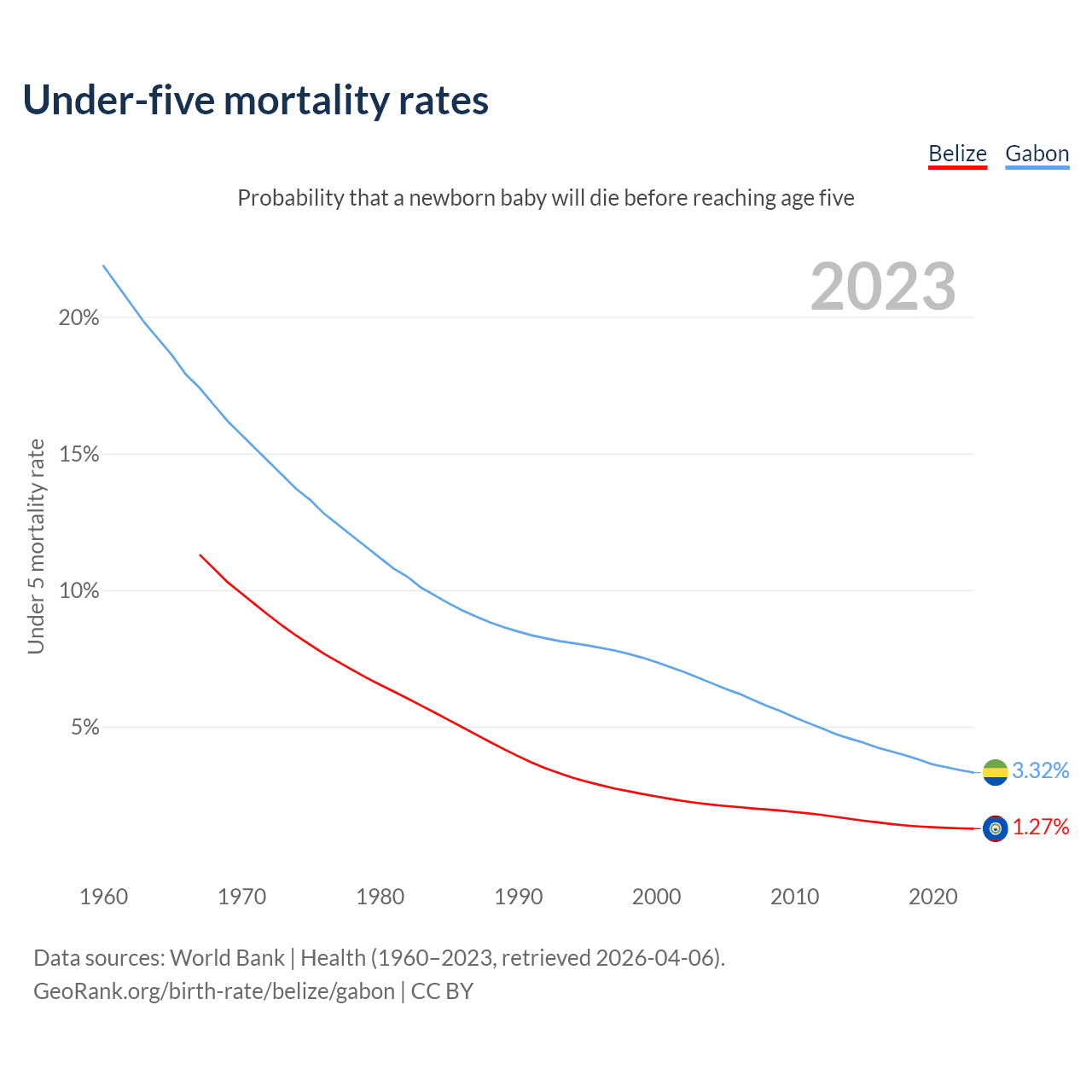 The chance that a newborn baby will die before reaching age five is 1.27% in Belize and 3.32% in Gabon. Above is a chart with historical data on under-five mortality rates.