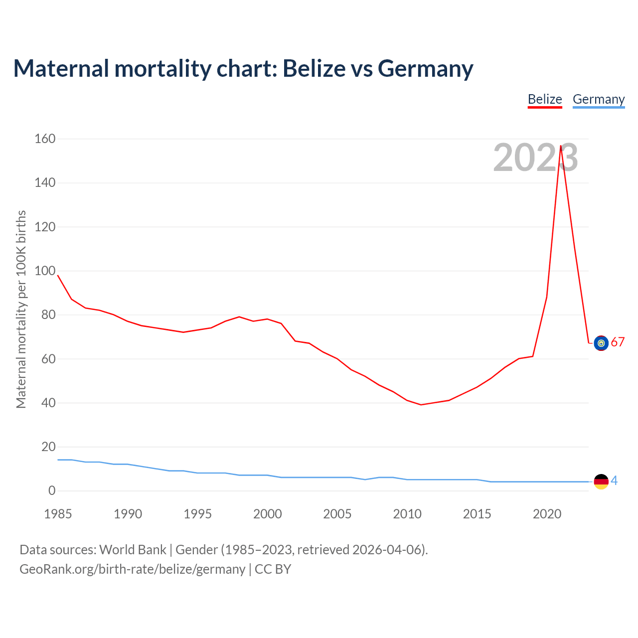The maternal mortality rate, which is the probability of dying during childbirth or within 42 days of pregnancy termination, is 67 deaths per 100,000 live births in Belize, compared to 4 deaths in Germany.