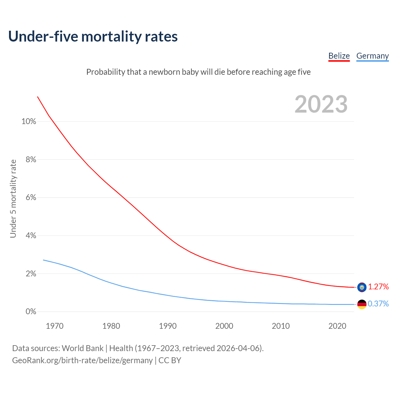 The chance that a newborn baby will die before reaching age five is 1.27% in Belize and 0.37% in Germany. Above is a chart with historical data on under-five mortality rates.