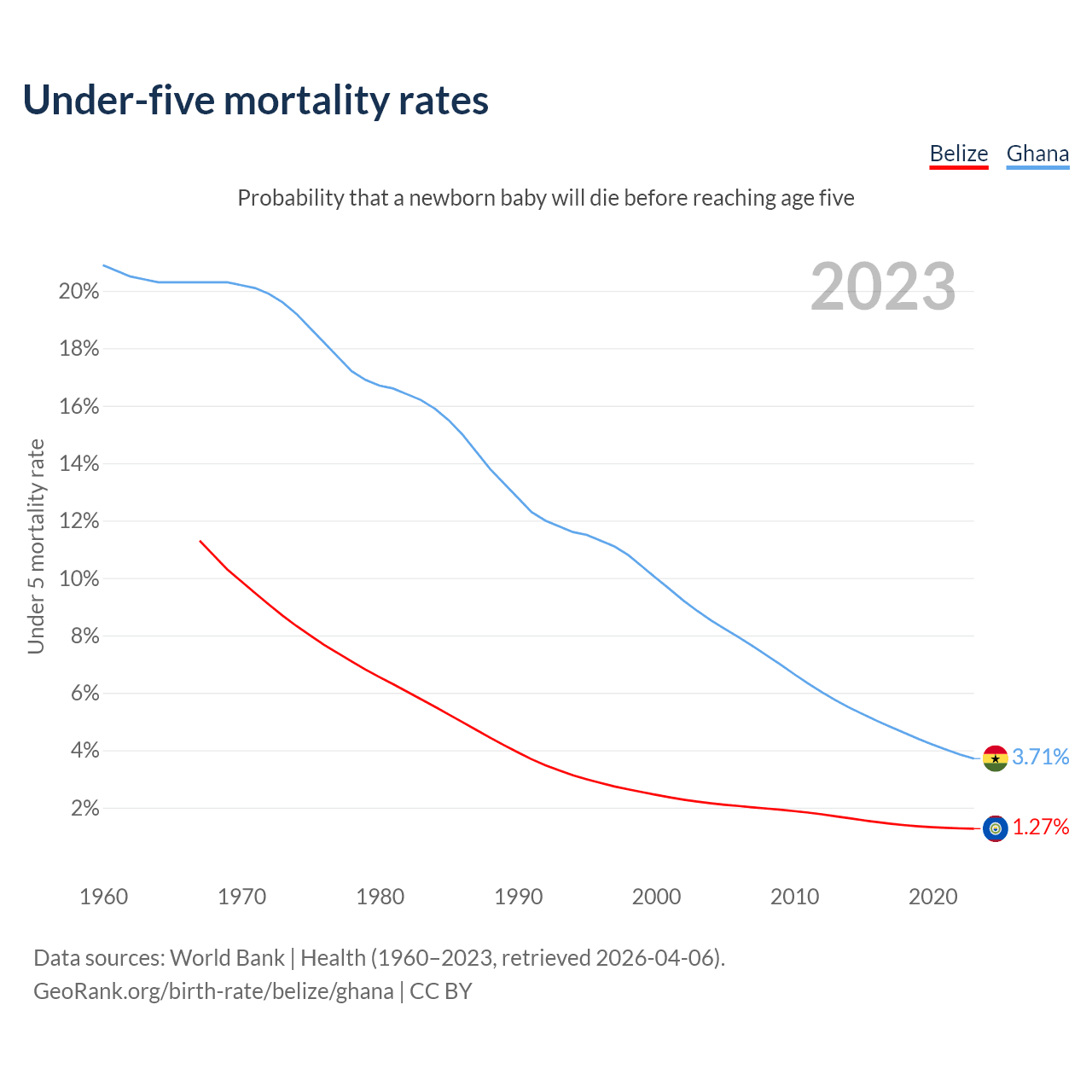 The chance that a newborn baby will die before reaching age five is 1.27% in Belize and 3.71% in Ghana. Above is a chart with historical data on under-five mortality rates.