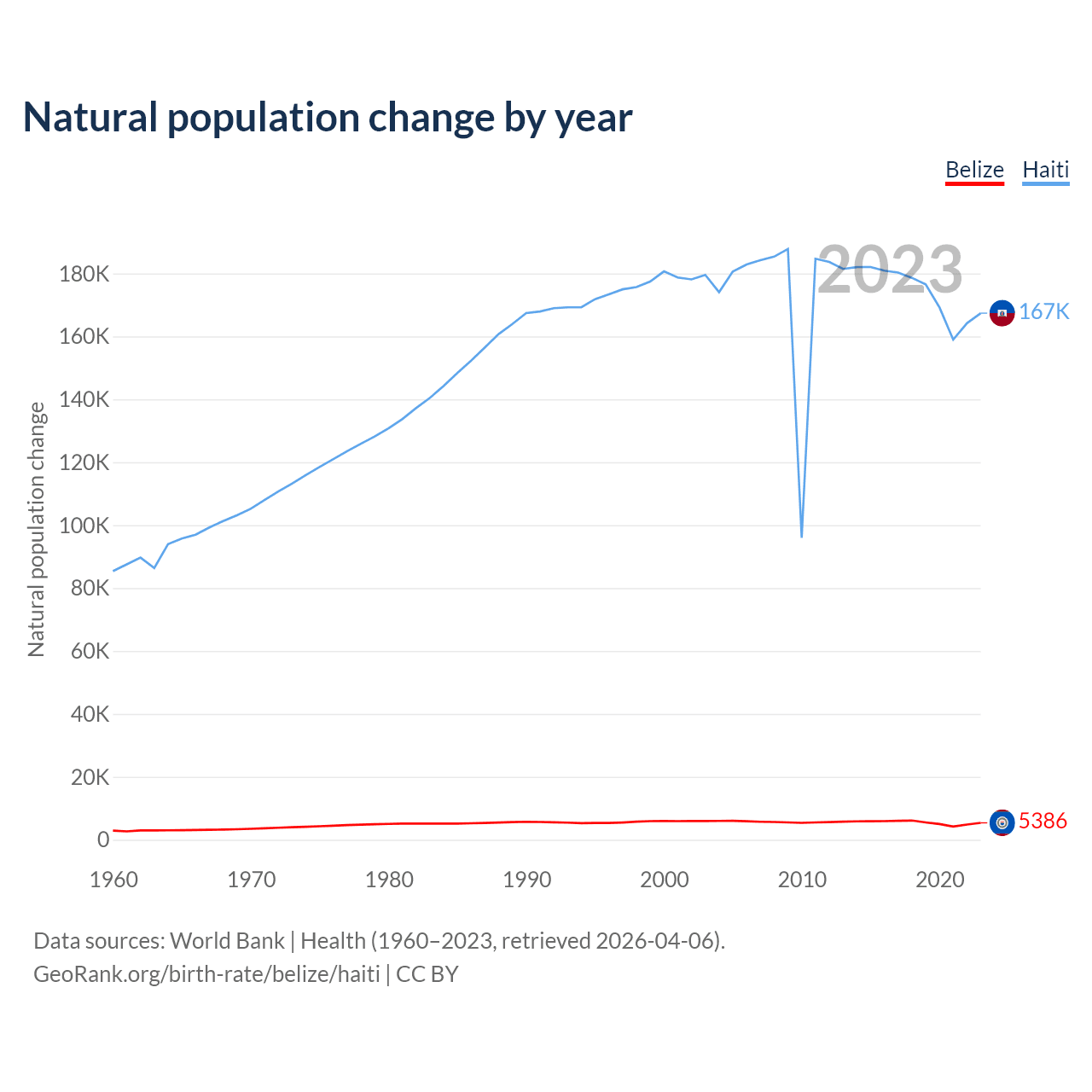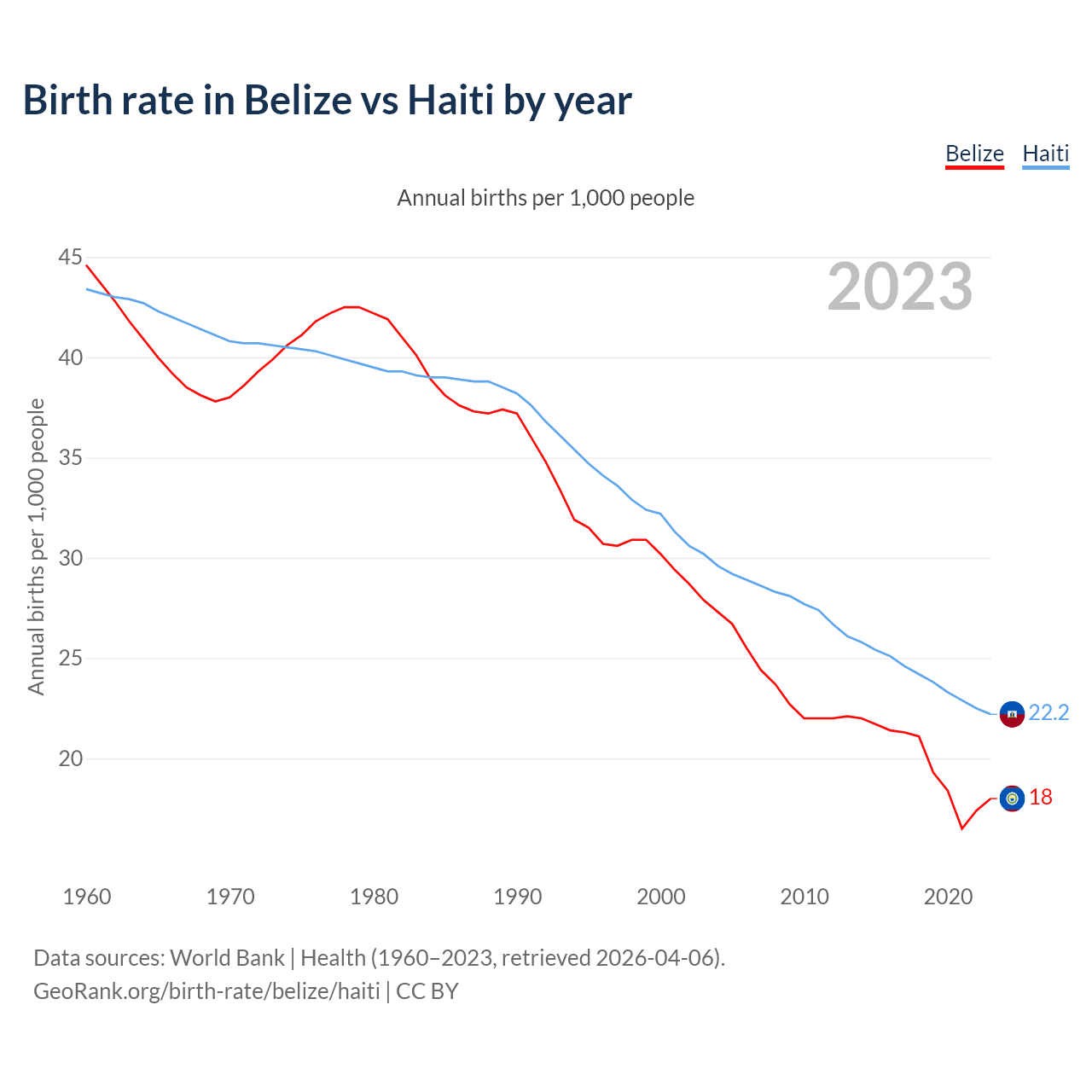 According to the latest available data on birth rates, the fertility rate in Belize was 2.01 children per woman in 2023, compared to 2.66 in Haiti in 2023. The replacement level is considered to be 2.1 children per woman.