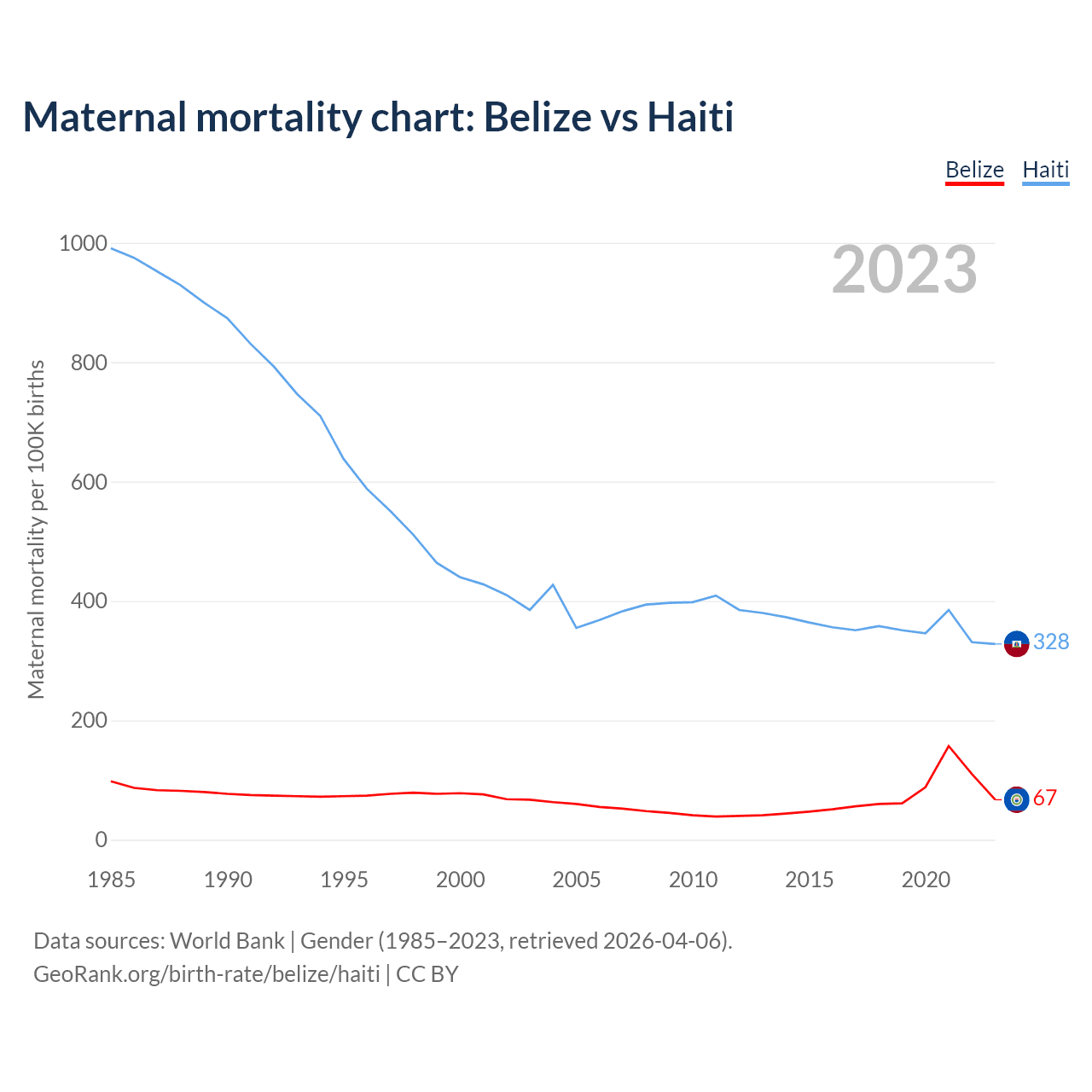 The maternal mortality rate, which is the probability of dying during childbirth or within 42 days of pregnancy termination, is 67 deaths per 100,000 live births in Belize, compared to 328 deaths in Haiti.