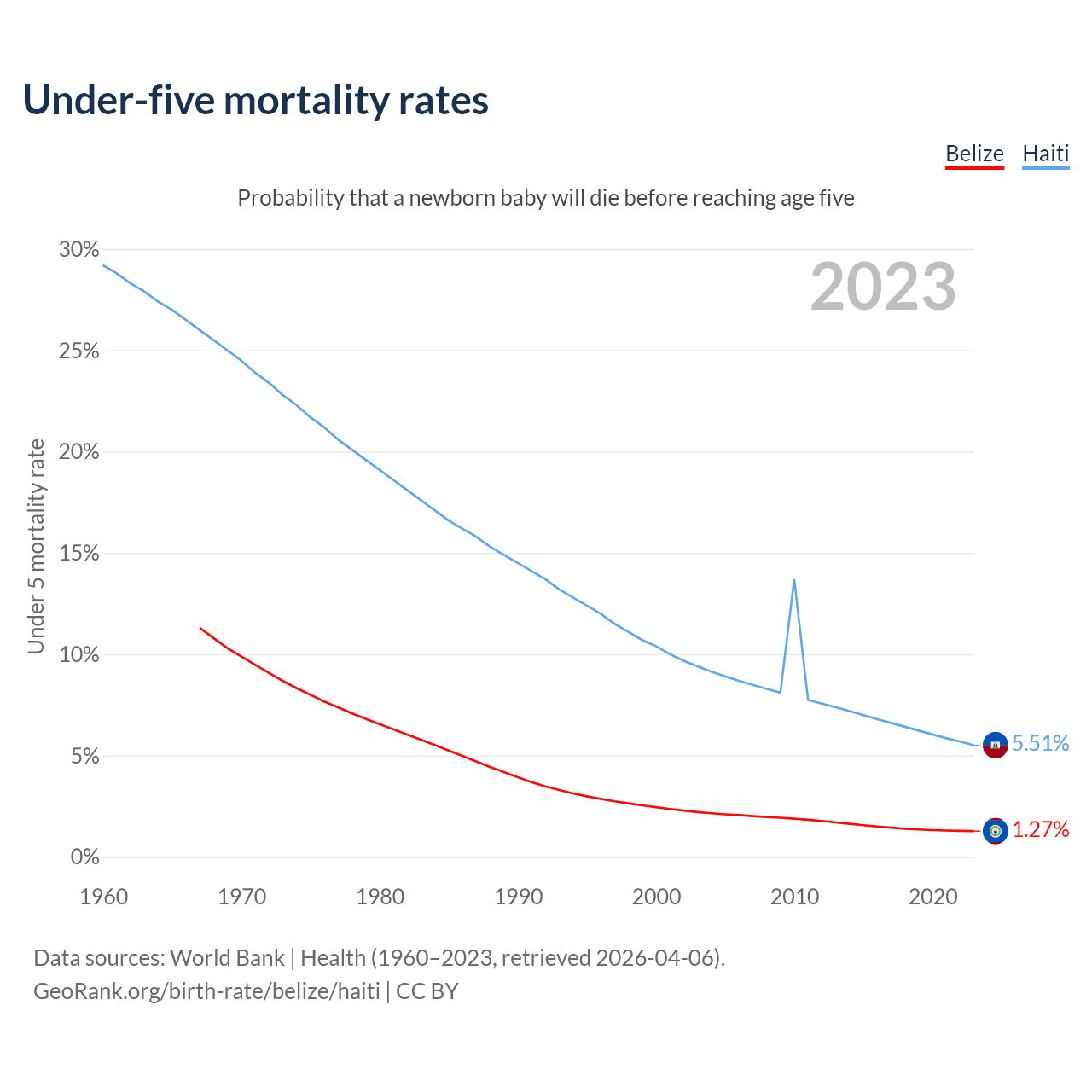 The chance that a newborn baby will die before reaching age five is 1.27% in Belize and 5.51% in Haiti. Above is a chart with historical data on under-five mortality rates.