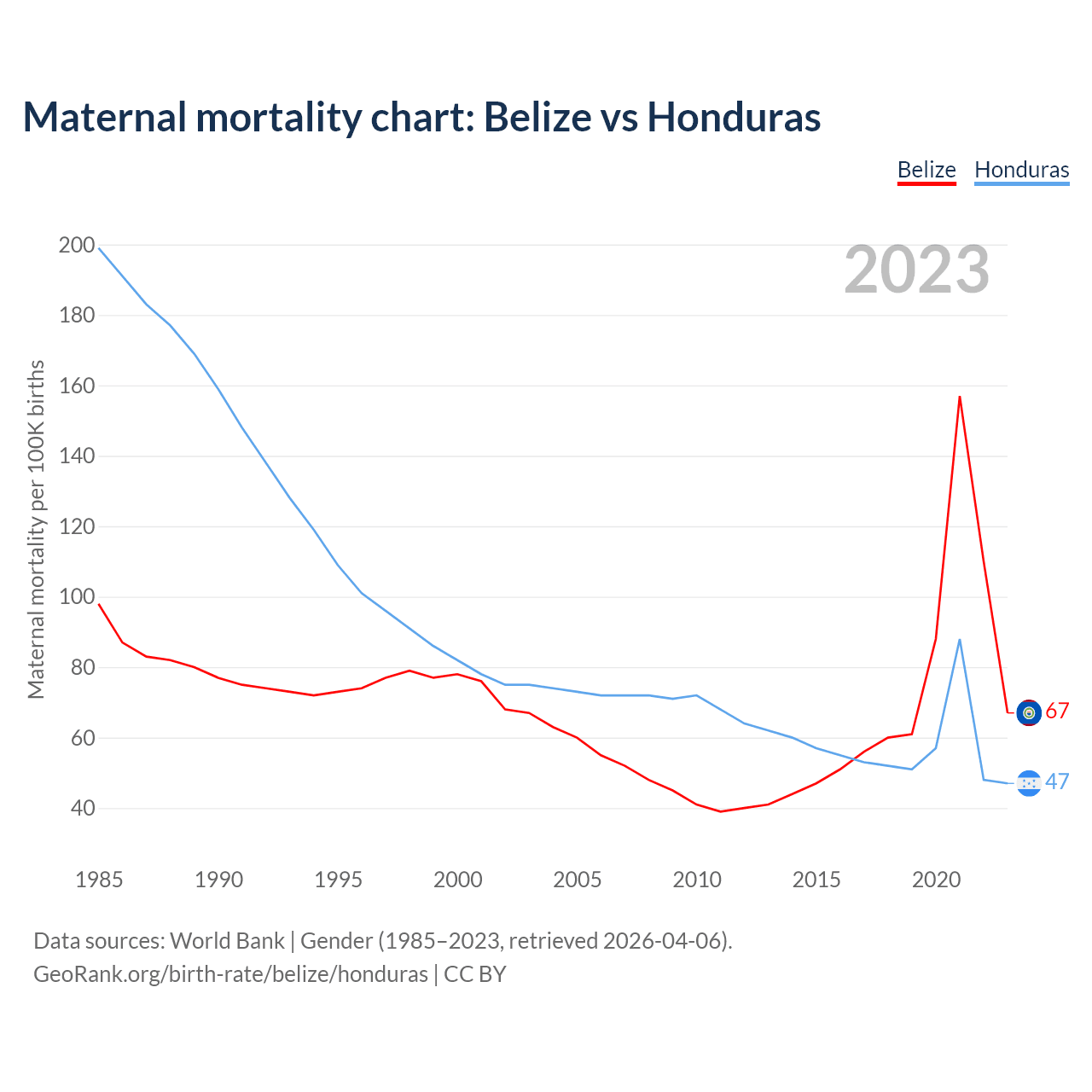 The maternal mortality rate, which is the probability of dying during childbirth or within 42 days of pregnancy termination, is 67 deaths per 100,000 live births in Belize, compared to 47 deaths in Honduras.