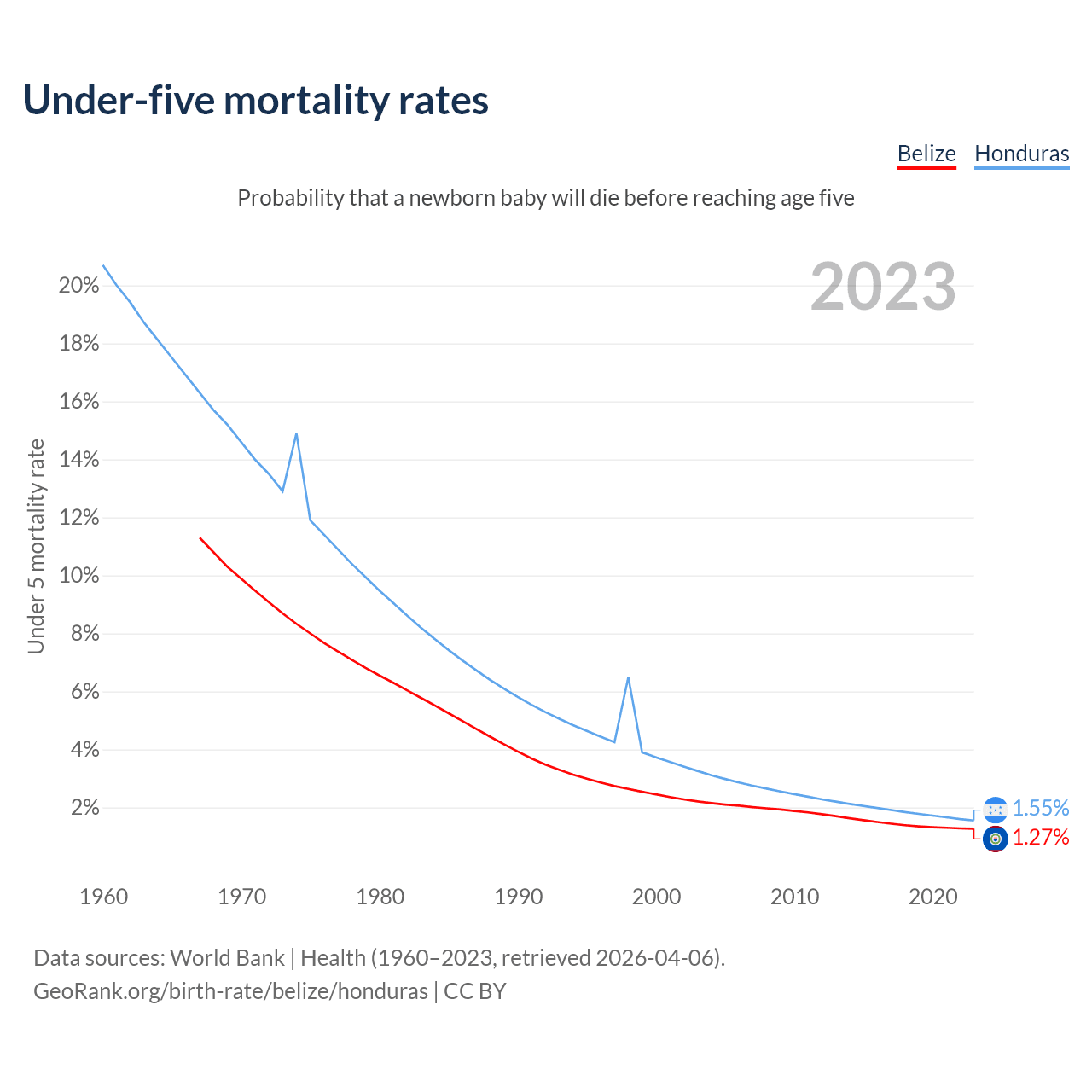The chance that a newborn baby will die before reaching age five is 1.27% in Belize and 1.55% in Honduras. Above is a chart with historical data on under-five mortality rates.