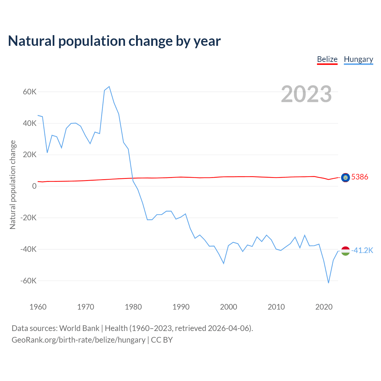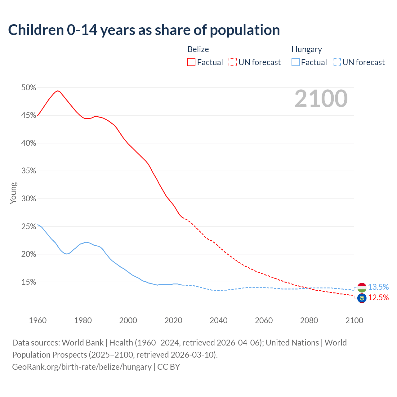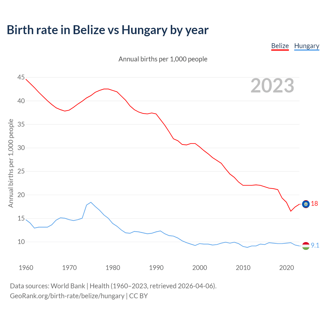 According to the latest available data on birth rates, the fertility rate in Belize was 2.01 children per woman in 2023, compared to 1.51 in Hungary in 2023. The replacement level is considered to be 2.1 children per woman.