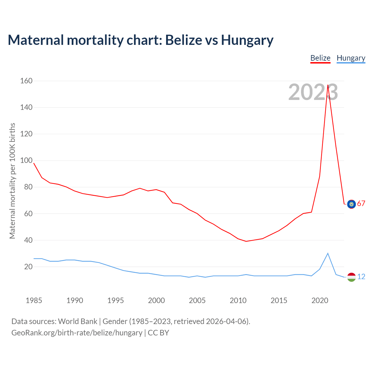The maternal mortality rate, which is the probability of dying during childbirth or within 42 days of pregnancy termination, is 67 deaths per 100,000 live births in Belize, compared to 12 deaths in Hungary.