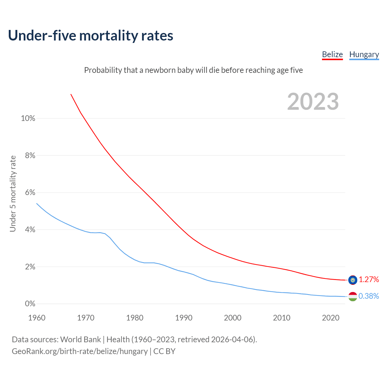 The chance that a newborn baby will die before reaching age five is 1.27% in Belize and 0.38% in Hungary. Above is a chart with historical data on under-five mortality rates.