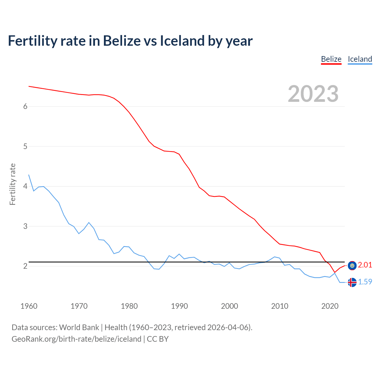 According to the latest available data on birth rates, the fertility rate in Belize was 2.01 children per woman in 2023, compared to 1.59 in Iceland in 2023. The replacement level is considered to be 2.1 children per woman.