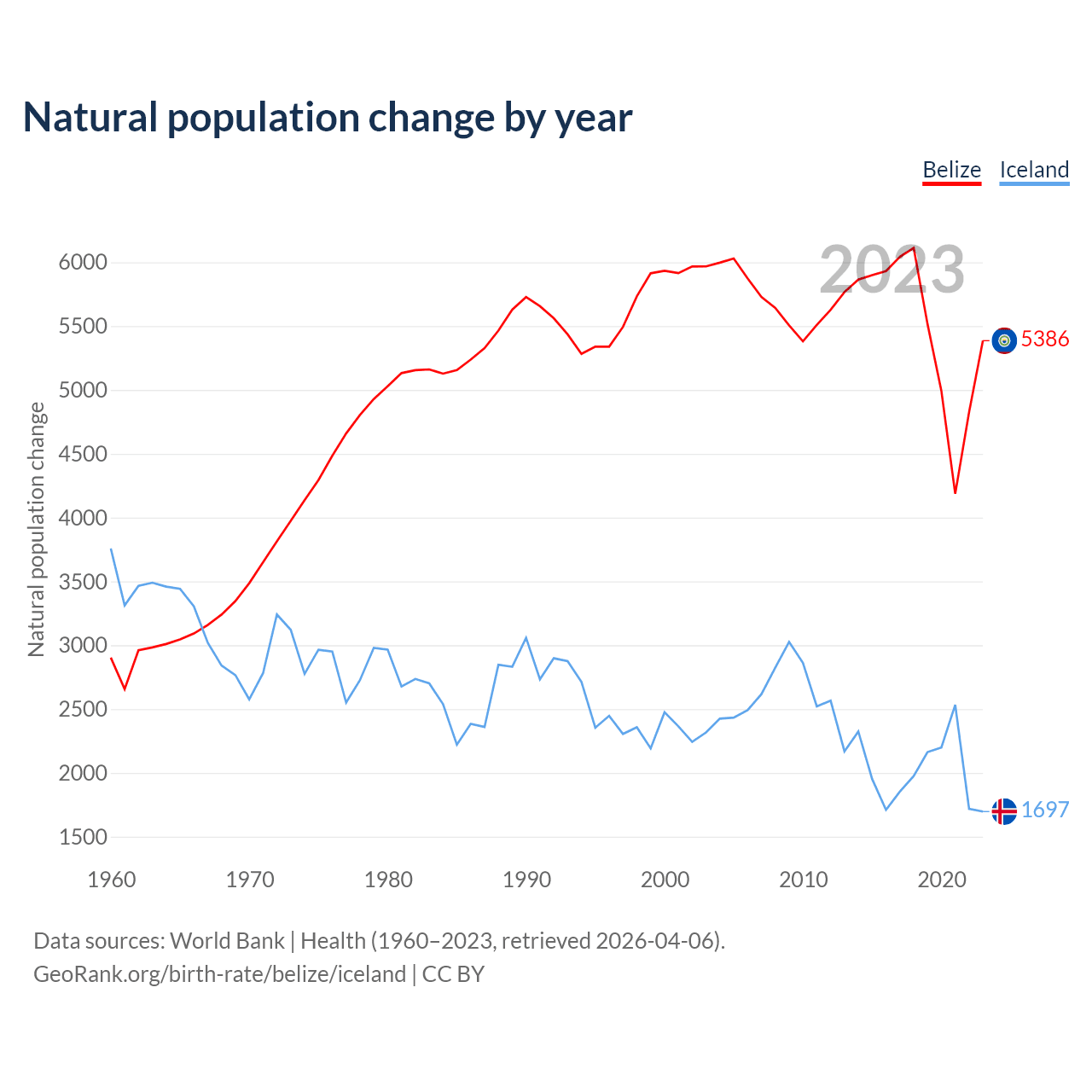 Belize has an annual birth rate of 18 births per 1,000 people, compared to 11 for Iceland. The average number of children a woman is expected to have during her lifetime — the fertility rate, is 2.01 in Belize and 1.59 in Iceland — 20.8% difference.