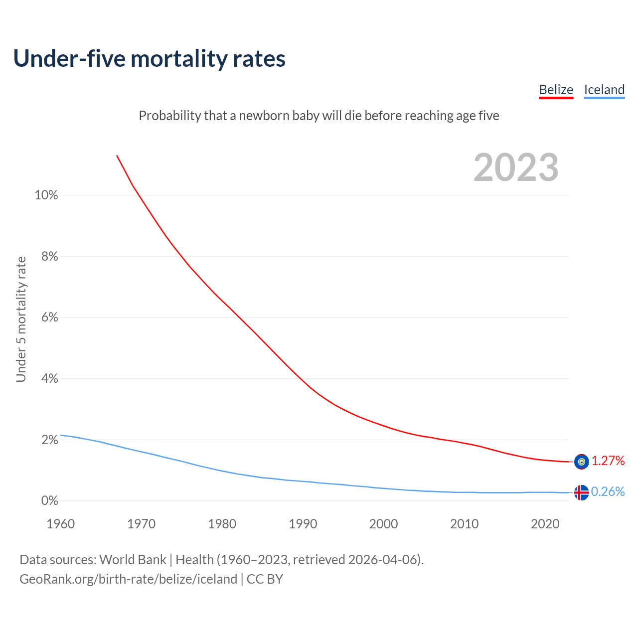 The chance that a newborn baby will die before reaching age five is 1.27% in Belize and 0.26% in Iceland. Above is a chart with historical data on under-five mortality rates.