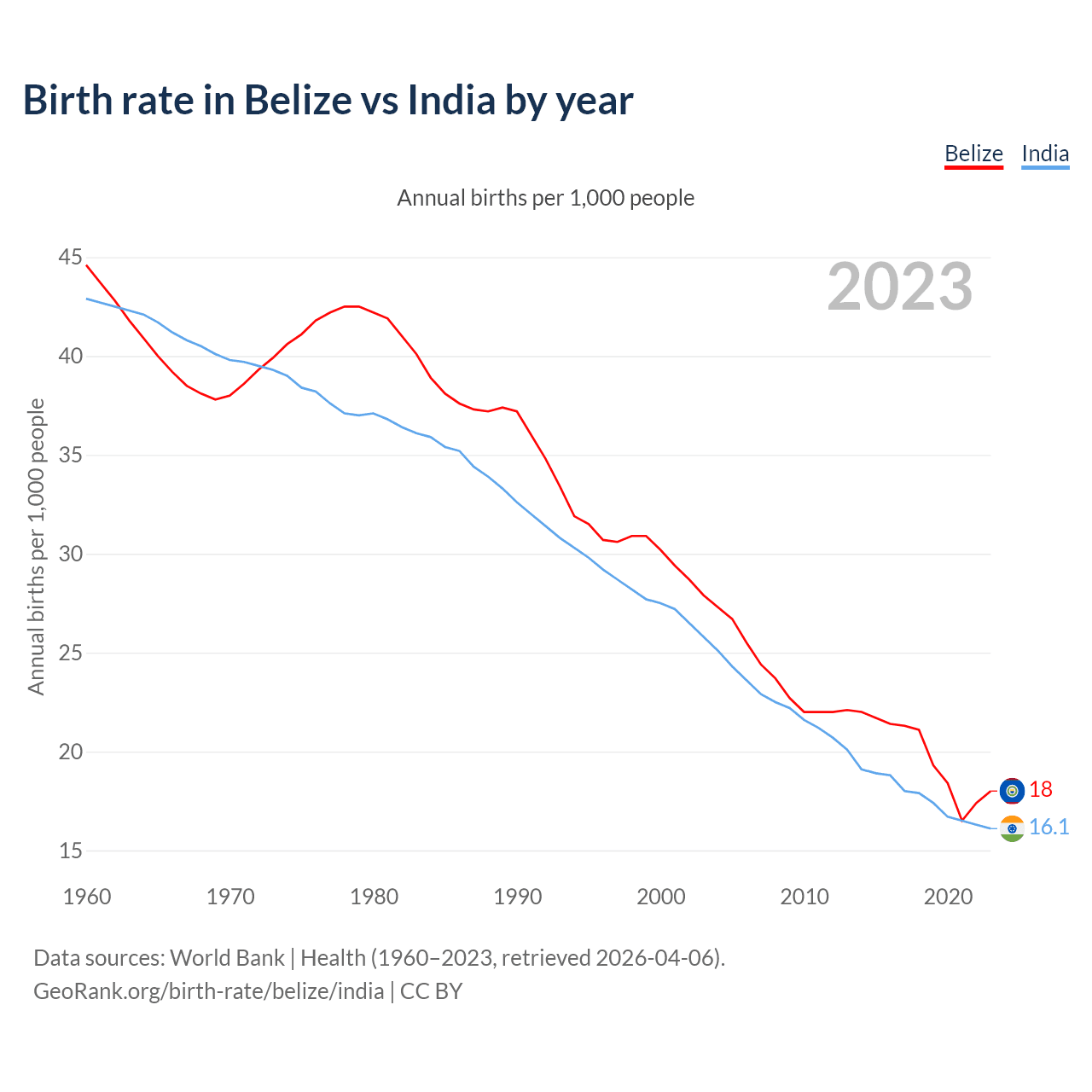 Belize has an annual birth rate of 18 births per 1,000 people, compared to 16.1 for India. The average number of children a woman is expected to have during her lifetime — the fertility rate, is 2.01 in Belize and 1.98 in India — 1.59% difference.