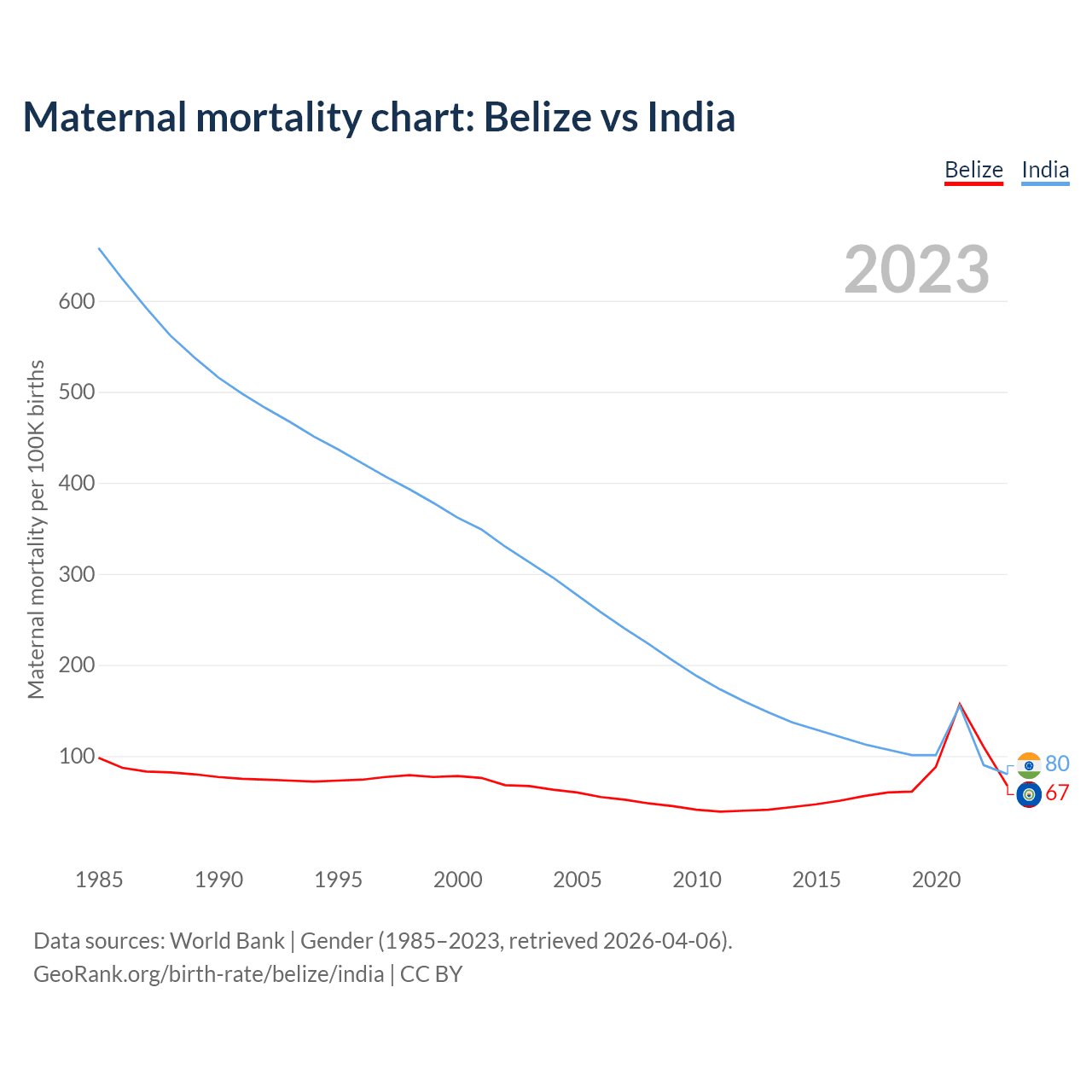 The maternal mortality rate, which is the probability of dying during childbirth or within 42 days of pregnancy termination, is 67 deaths per 100,000 live births in Belize, compared to 80 deaths in India.