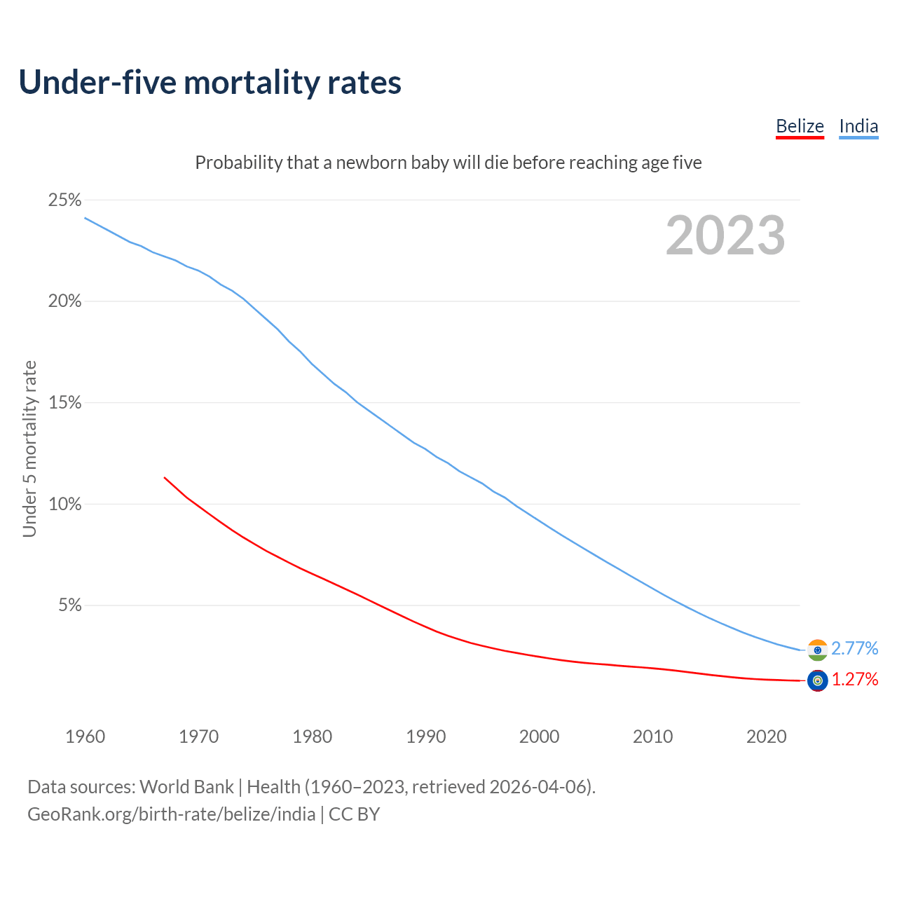 The chance that a newborn baby will die before reaching age five is 1.27% in Belize and 2.77% in India. Above is a chart with historical data on under-five mortality rates.