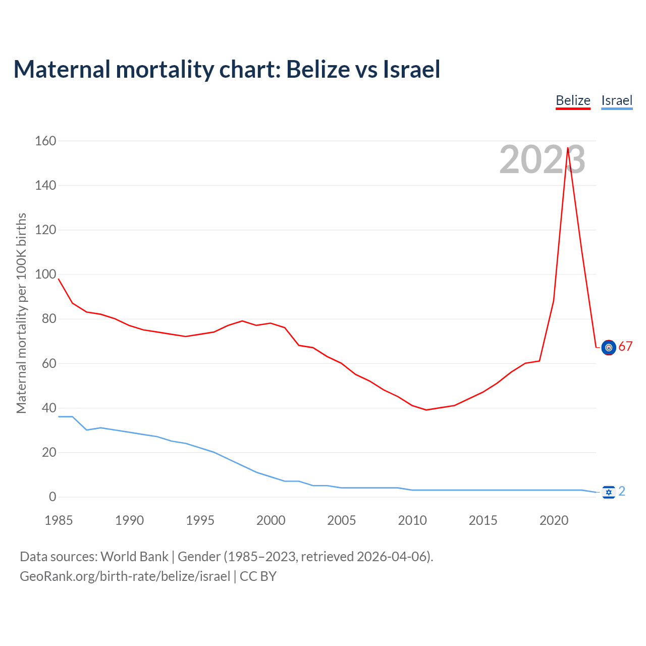 The maternal mortality rate, which is the probability of dying during childbirth or within 42 days of pregnancy termination, is 67 deaths per 100,000 live births in Belize, compared to 2 deaths in Israel.