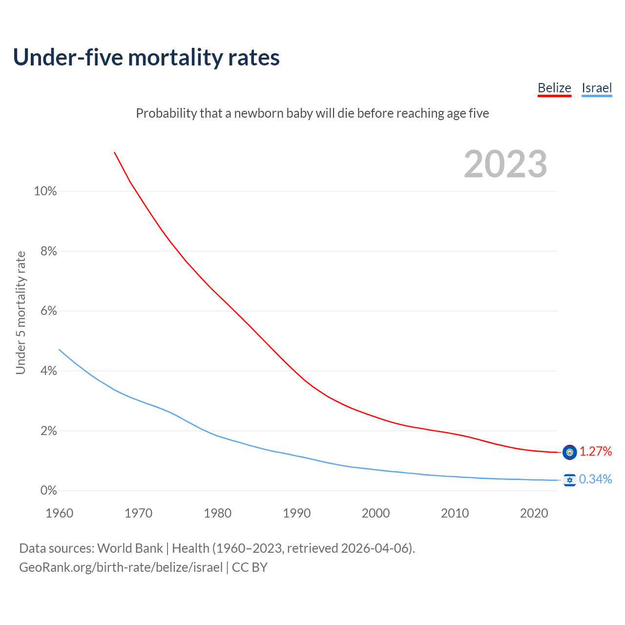 The chance that a newborn baby will die before reaching age five is 1.27% in Belize and 0.34% in Israel. Above is a chart with historical data on under-five mortality rates.